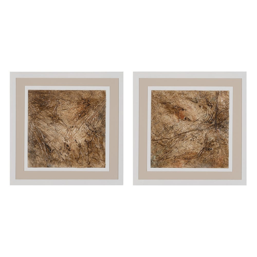 Acest set de tablouri pătrate aduce în decor o energie subtilă și naturală, redată prin texturi bogate și tonuri pământii. Fiecare piesă este pictată manual cu acrilic pe fundal texturat, rezultând într-o compoziție abstractă cu impact vizual și tactil. Nuanțele de maro, bronz și accente calde oferă o senzație de echilibru, profunzime și confort vizual.
