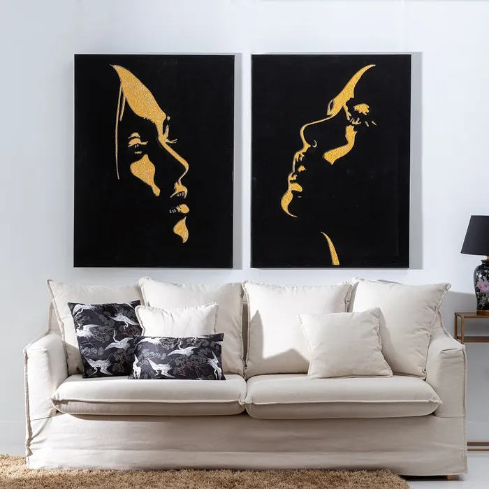 Acest set de două tablouri cu portrete stilizate, realizat pe pânză, are dimensiuni de 90 X 2,8 X 120 cm fiecare și aduce un design modern și minimalist cu accente aurii. Contrastul dintre nuanțele întunecate și detaliile aurii adaugă un aer sofisticat și misterios, transformând orice spațiu într-un loc plin de eleganță. Aceste tablouri sunt ideale pentru a decora pereții din living, dormitor sau birou, oferind un punct focal care atrage privirile și completează interioarele contemporane. Perfecte pentru a adăuga un plus de stil în locuința ta.