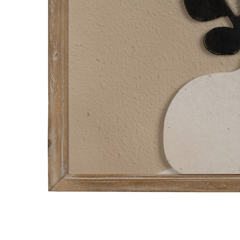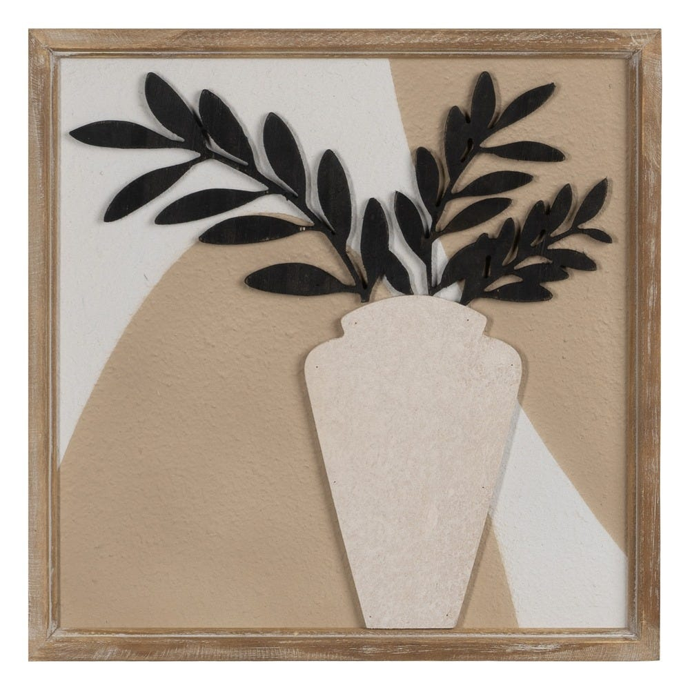 Set de 2 tablouri pătrate 40x40 cm cu vaze în relief și frunze negre pe fundal bej. Stil rustic modern cu ramă din lemn antichizat, montaj inclus.