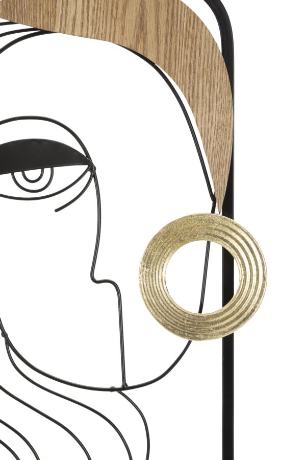 Explorând simplitatea modernă, această decorațiune îmbină lemnul natural cu detalii metalice pentru a crea siluete umane abstracte. Cu dimensiuni generoase de 52 cm în lățime și 63 cm în înălțime, designul combină liniile elegante metalice negre cu fundaluri din lemn, aducând un element distinctiv oricărui spațiu. Elementul circular auriu adaugă un plus de eleganță, fără a încărca vizual. Perfectă pentru a aduce un accent subtil, dar impresionant într-un birou sau living, această decorațiune se integrează armonios în diferite stiluri de interior.