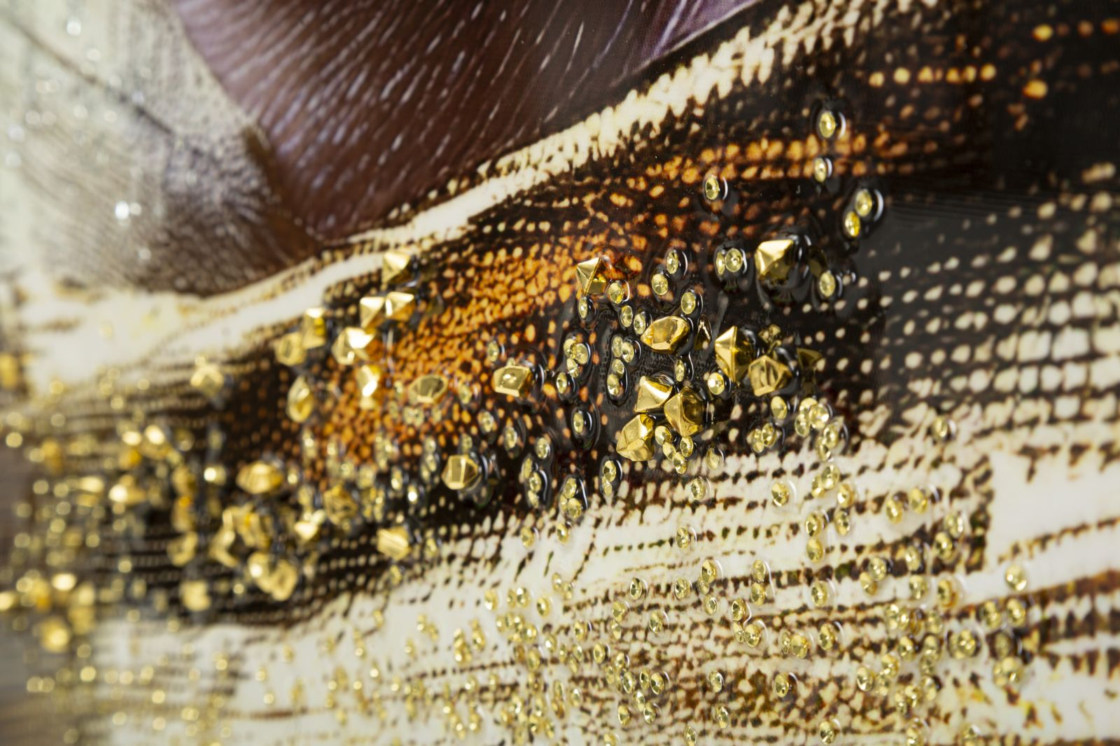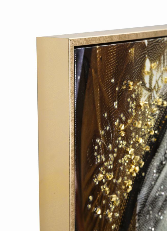 Pânza este întinsă pe ramă din lemn de brad, cu aplicații din plastic care accentuează zonele aurii ale materialului și intensifică efectul vizual prin reflexii. Această piesă este perfectă pentru birouri creative, spații de relaxare cu tematică urbană, interioare industriale sau camere amenajate în stil contemporan minimalist, unde accentul cade pe artă cu mesaj.