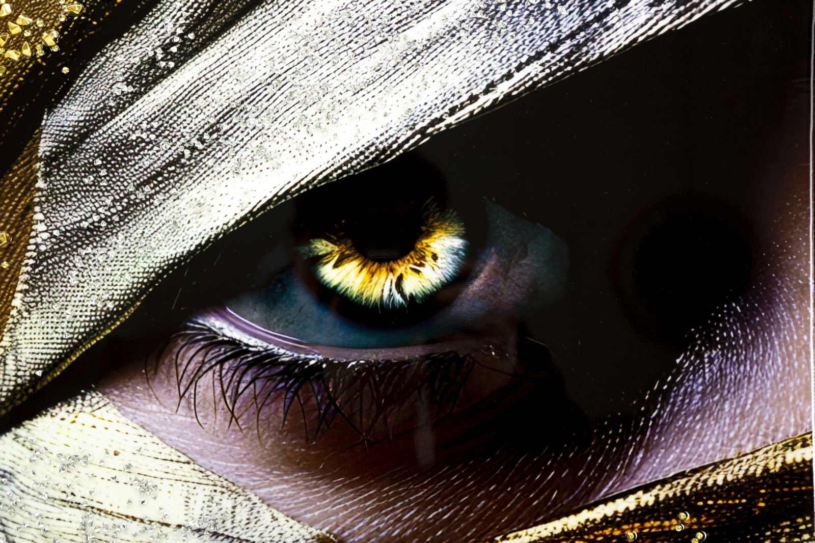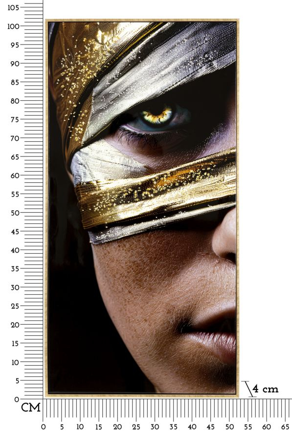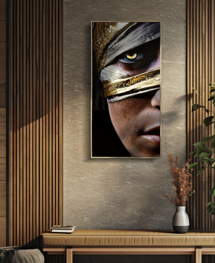 Compoziția se concentrează pe un cadru parțial al chipului unui personaj enigmatic, cu ochi hipnotizant de felină și pielea înfășurată în benzi metalice aurii și argintii. Texturile strălucitoare ale țesăturii creează jocuri de lumină dramatice, accentuate de detaliile realiste ale pielii și privirii pătrunzătoare. Este o imagine care transmite forță interioară, introspecție și un soi de vigilență tăcută – ideală pentru spații în care designul interior este despre impact și poveste.
