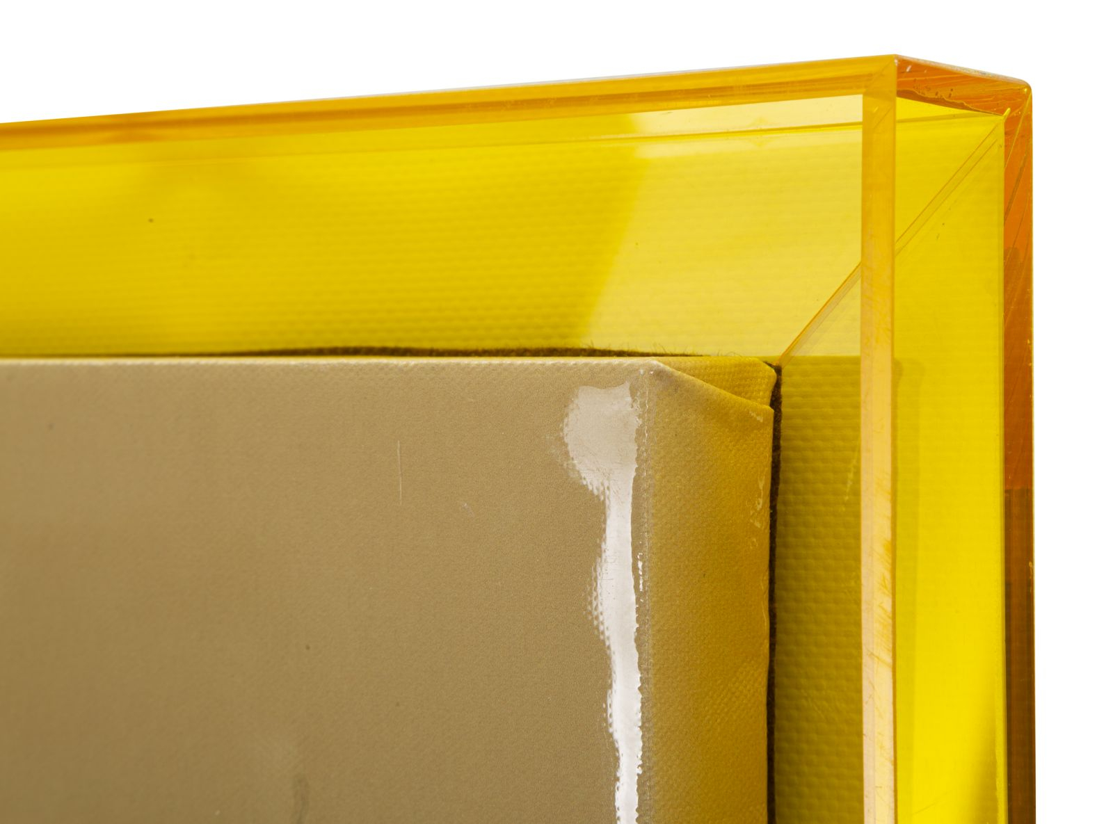 Compoziția abstractă, alcătuită din dreptunghiuri perfect proporționate, este imprimată pe pânză (tela) și montată pe suport solid din MDF. Suprafața este finisată cu elemente sintetice lucioase, care reflectă lumina într-un mod subtil și adaugă profunzime compoziției. Rama din plastic galben translucid încununează tabloul cu un efect vizual aparte – modern, jucăuș, dar sofisticat.