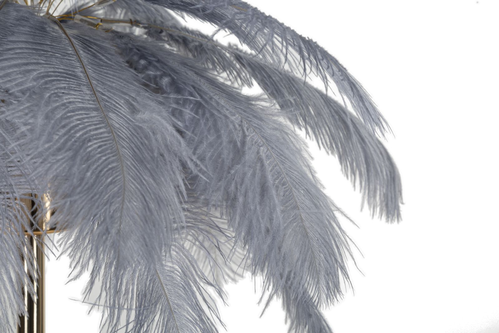 Cauți veioze cu pene? Îți prezentăm această lampă de masă elegantă, cu dimensiuni de 55x60 cm, care aduce o notă de rafinament în orice încăpere. Baza stabilă cu picior subțire auriu susține un mănunchi de pene gri deschis cu fir lung, creând un aspect asemănător unui palmier. Dispunând de două surse de lumină (becurile nu sunt incluse), această piesă oferă un iluminat ambiental cald și plăcut. Lumina filtrată prin pene creează o atmosferă glamour, ideală pentru dormitor sau living.