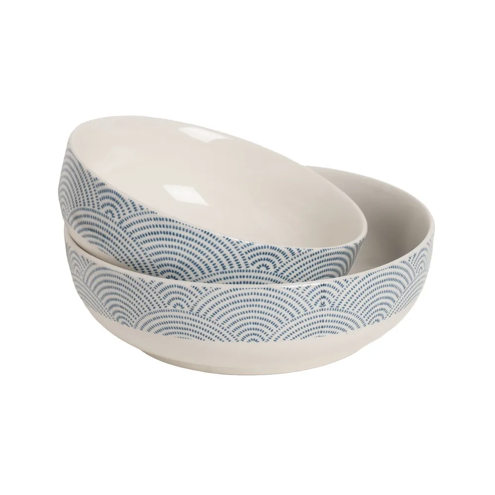 Farfurii adânci alb-albastre cu model oriental, excelente pentru supe și paste. Adaugă eleganță și exotism mesei.