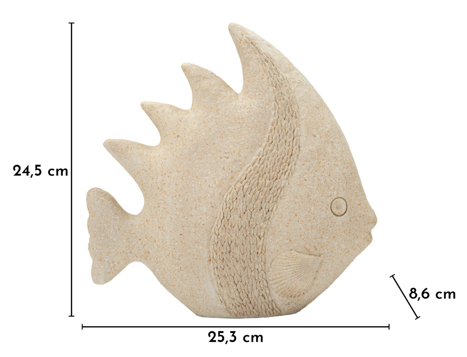 Figurina decorativă Fish Sand redă silueta unui pește stilizat, realizat cu un finisaj special ce imită textura nisipului. Suprafețele delicate și detaliile fine inspirate din formele naturale ale solzilor și aripioarelor aduc un aer marin autentic și relaxant.