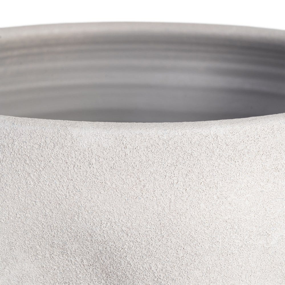 Designul ghiveciului este definit de o siluetă rotunjită și compactă, completată de o margine superioară groasă și bine conturată. Suprafața ceramică are o textură vizibilă și un finisaj cu aspect de piatră care oferă profunzime vizuală și un caracter natural piesei.