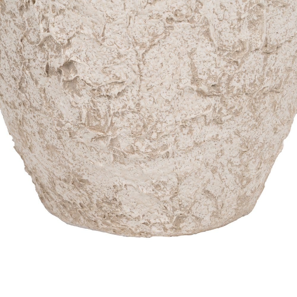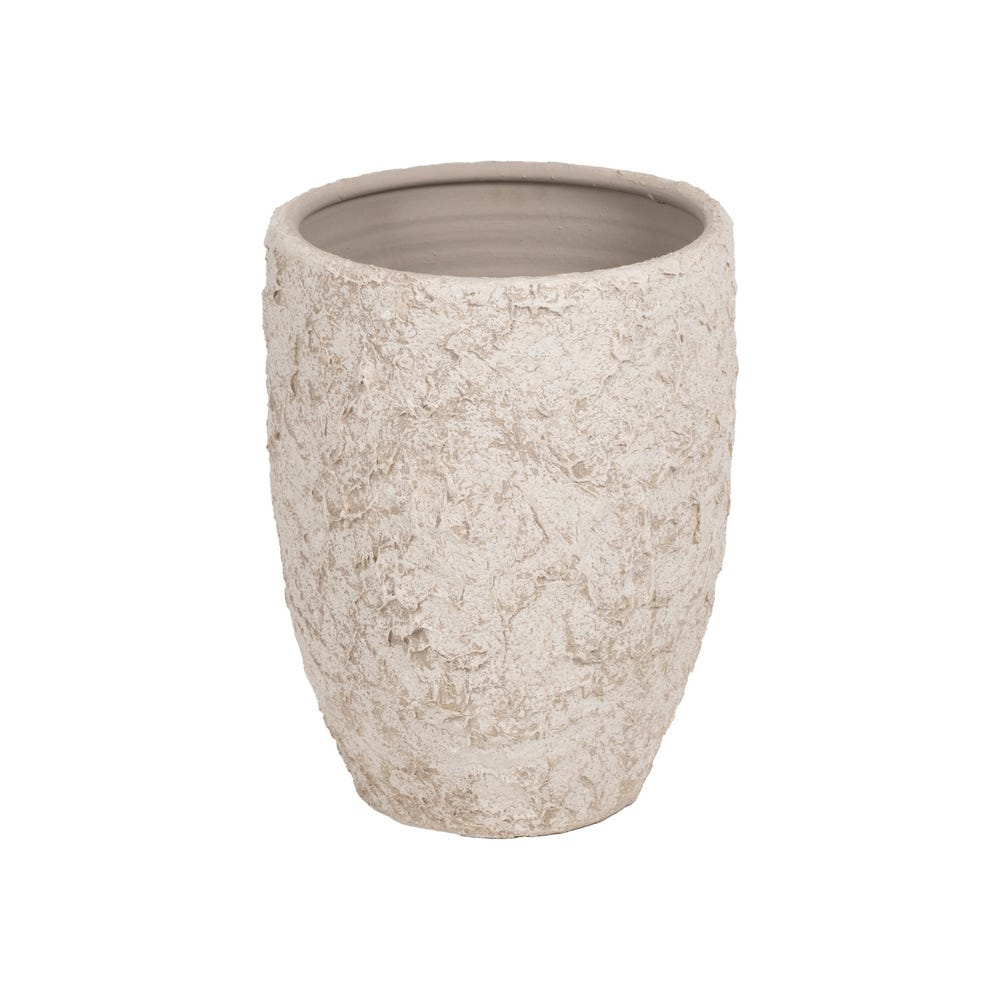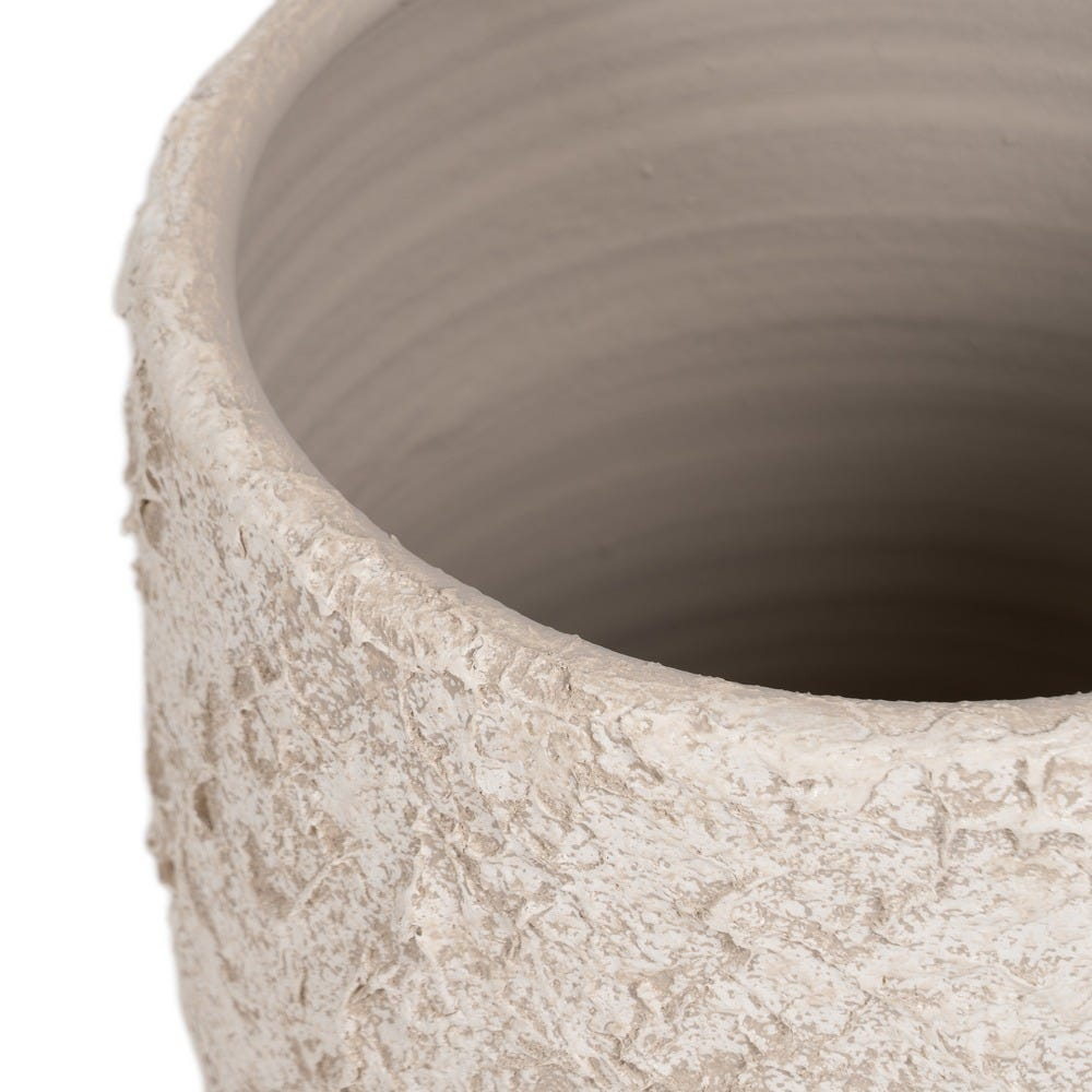 Suprafața este texturată și ușor neregulată, oferind un aspect autentic și plin de caracter. Nuanța de alb este versatilă și pune în valoare atât forma ghiveciului, cât și plantele pe care le găzduiește, contribuind la un decor echilibrat.