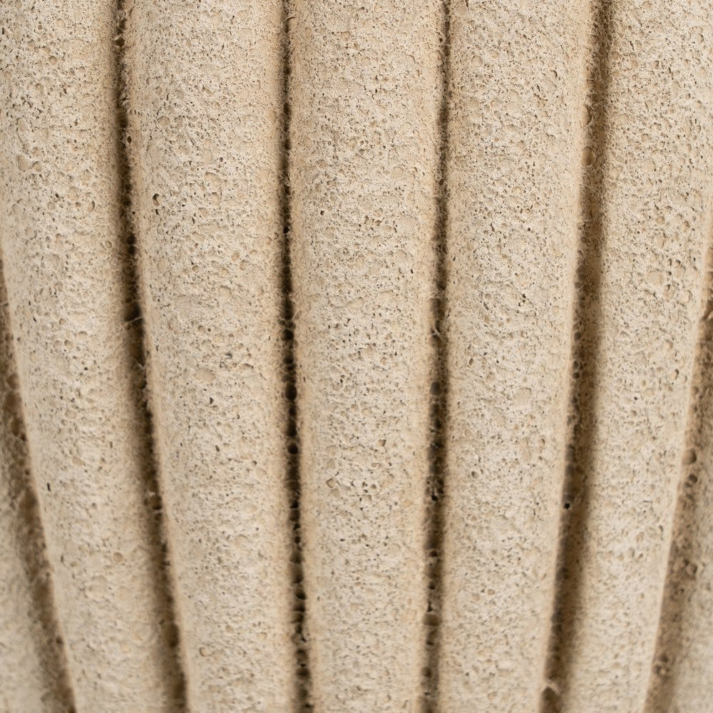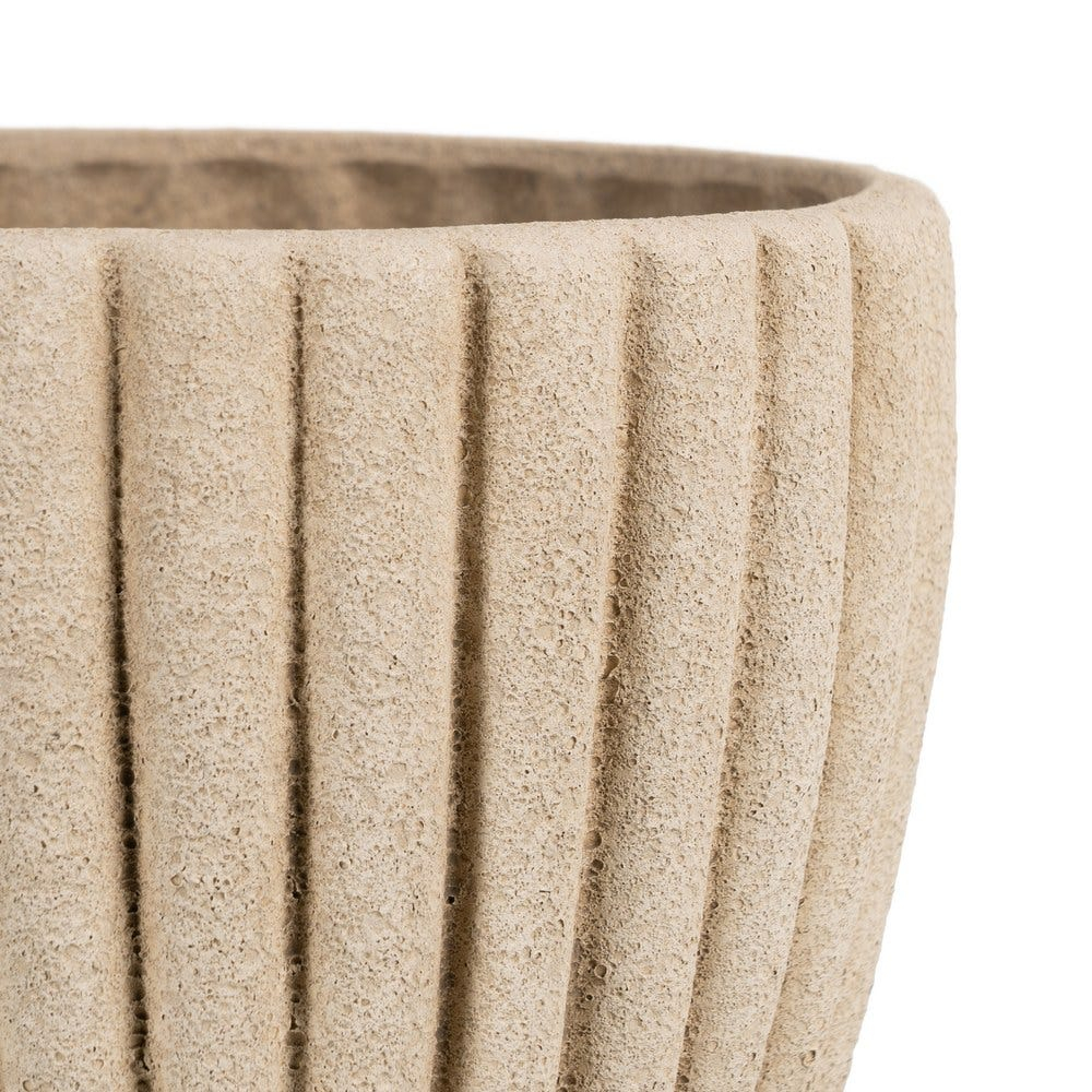 Designul ghiveciului este definit de forma rotunjită și de suprafața striată cu linii verticale care oferă ritm și profunzime vizuală piesei. Textura ceramică și finisajul cu aspect de piatră accentuează caracterul natural al obiectului.