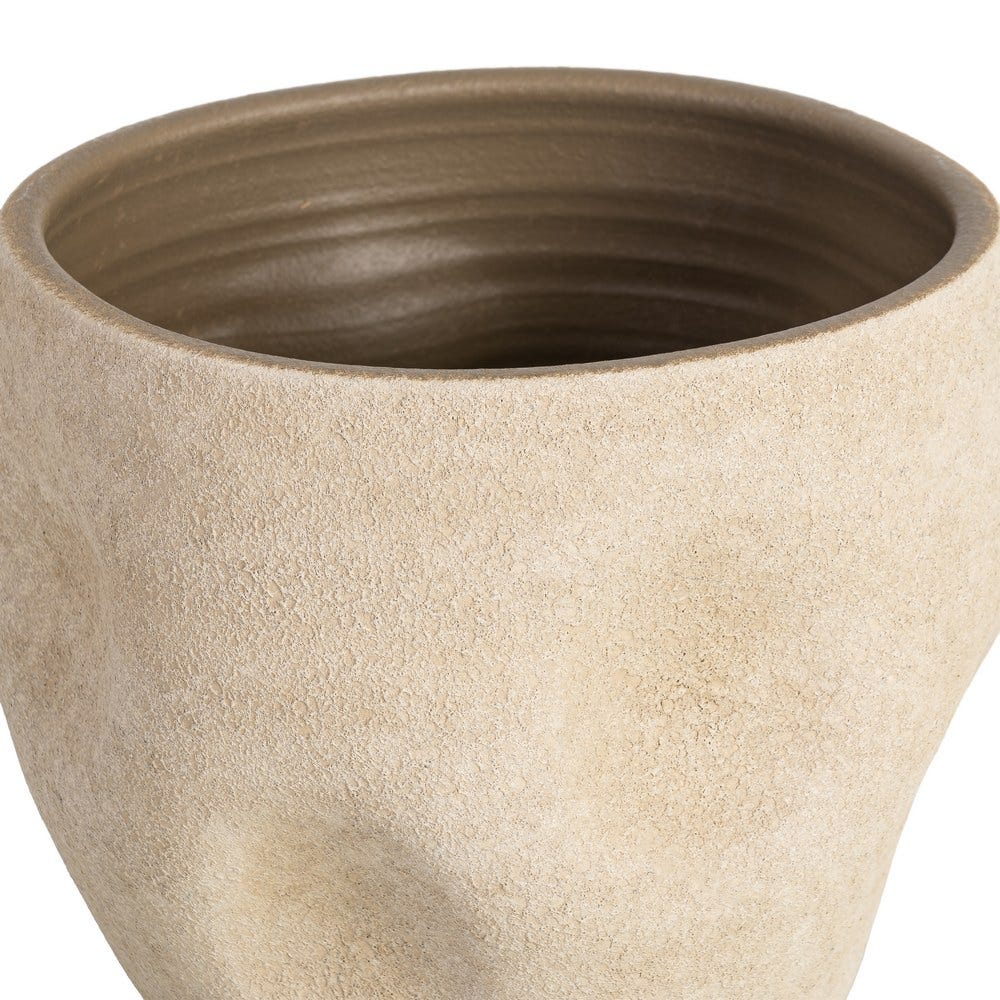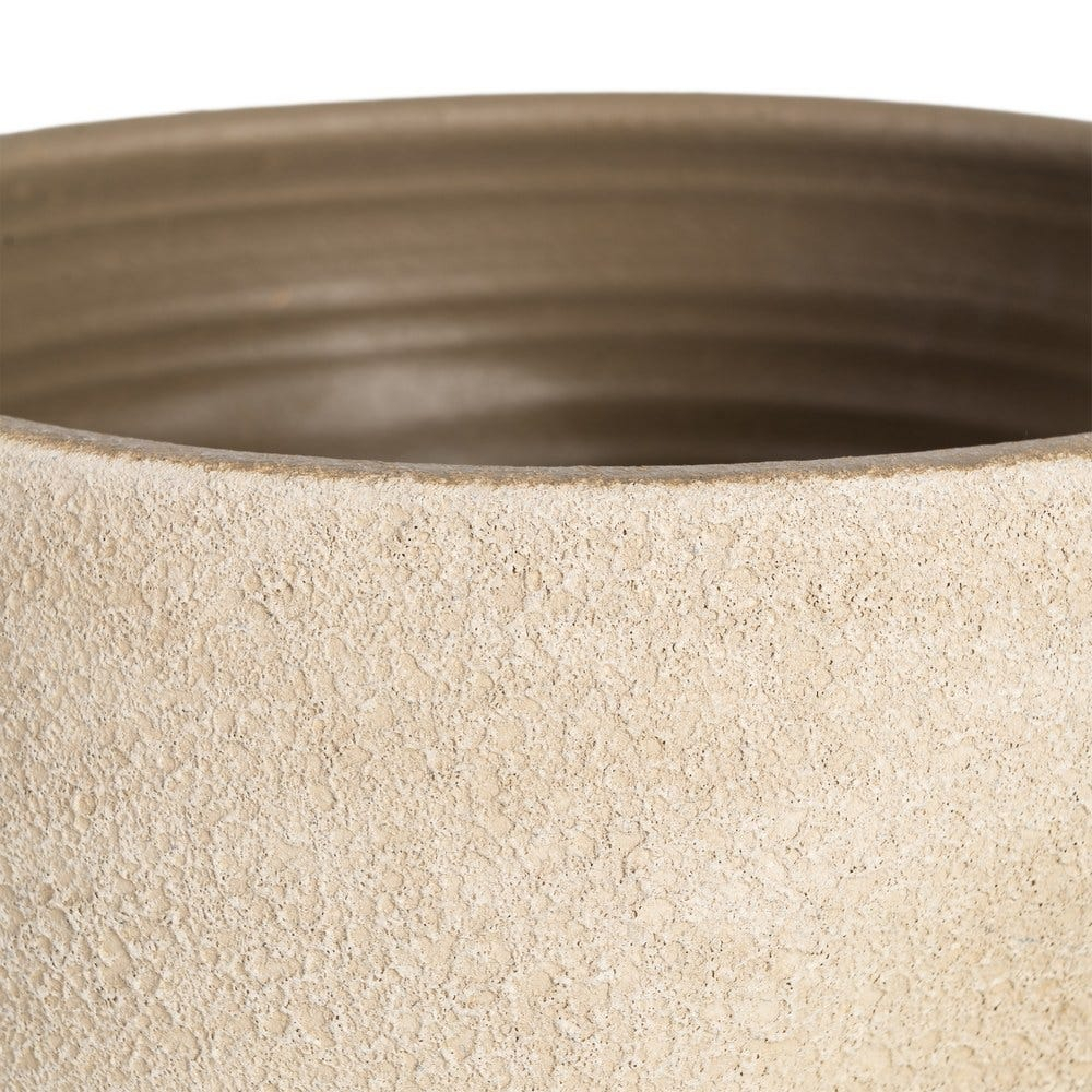 Dimensiunea sa îl face ușor de integrat atât pe podea, cât și lângă o piesă de mobilier. Tonul cald de bej și textura sa inspirată din piatră ajută ghiveciul să se potrivească natural în diferite tipuri de amenajări interioare.
