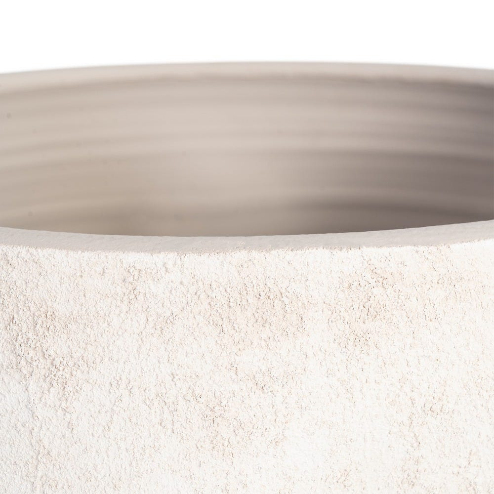 Designul ghiveciului este definit de o siluetă rotunjită și stabilă, completată de o margine superioară groasă și bine conturată. Suprafața ceramică are o textură vizibilă și un finisaj cu aspect de piatră care oferă profunzime vizuală și un caracter natural piesei.