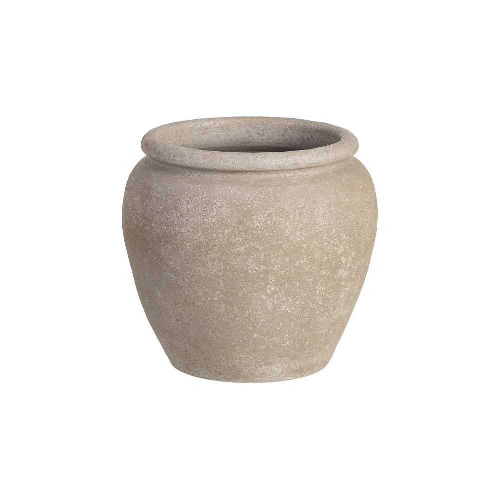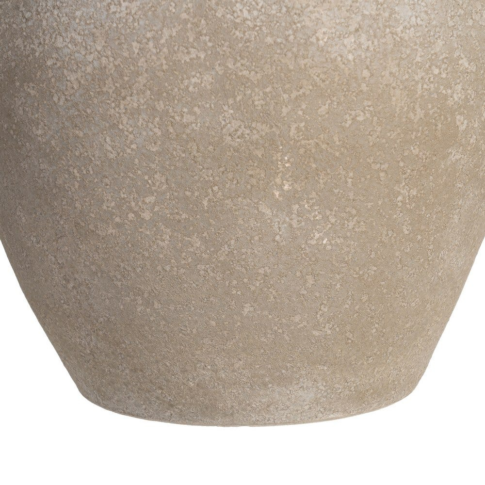 Designul ghiveciului este definit de o siluetă rotunjită și compactă, completată de o margine superioară groasă și bine conturată. Suprafața ceramică are o textură vizibilă care oferă profunzime vizuală și un aspect ușor natural piesei.