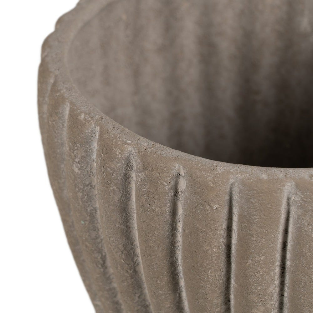 Ghiveciul are o formă rotunjită cu suprafață striată și linii verticale care creează un efect decorativ elegant.