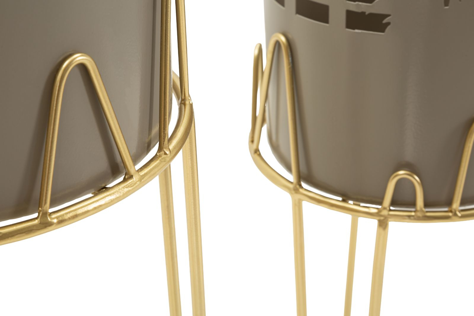 Setul de suporturi pentru ghivece Flower îmbină delicatețea naturii cu eleganța metalului într-un design rafinat și luminos. Vasul gri satinat este decorat cu motive florale decupate artistic, iar structura metalică aurie oferă un contrast elegant care atrage imediat privirea.