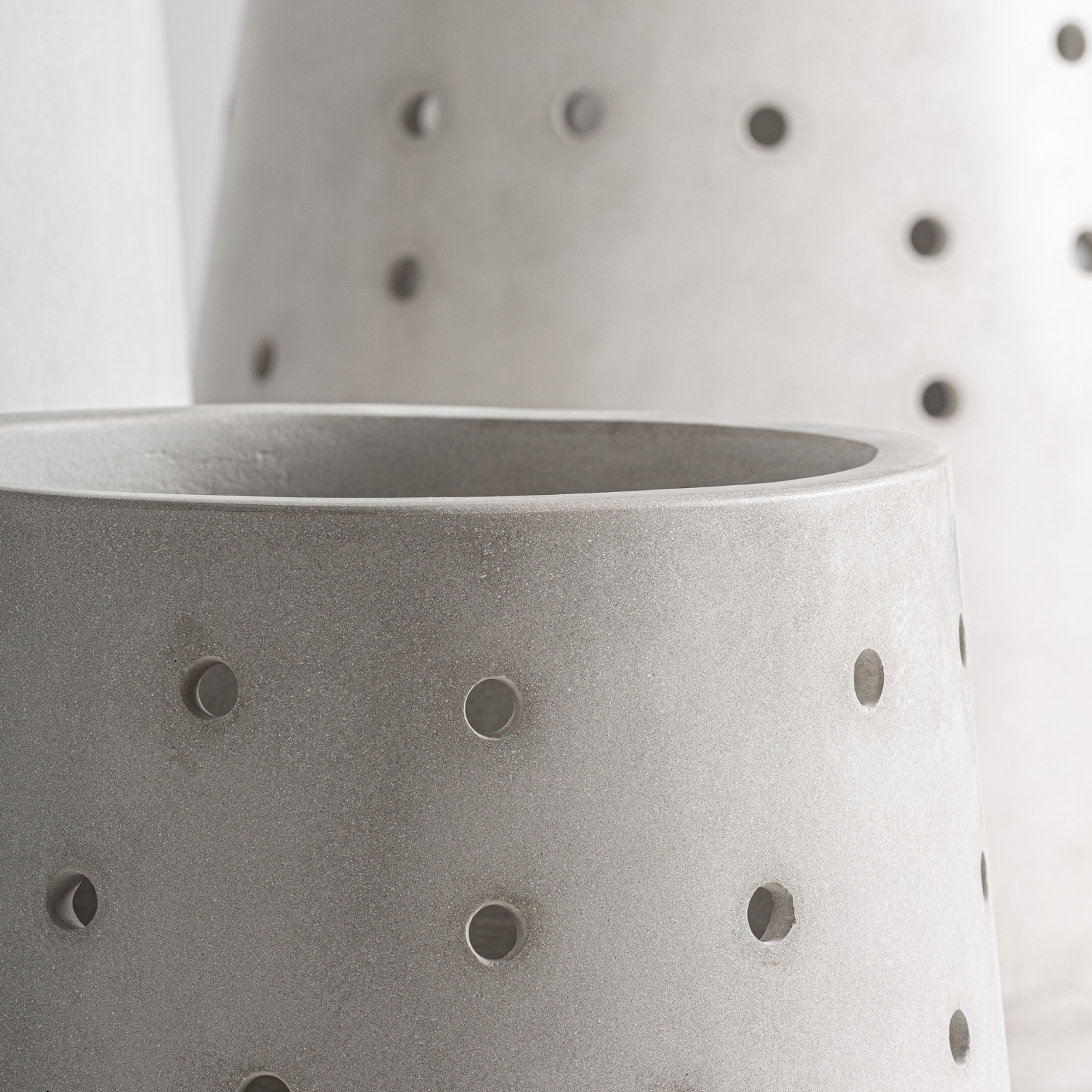 Setul de ghivece Jacquard J/3, realizat de Estudi{H}ac pentru Vical, propune o interpretare contemporană a formelor sculpturale, printr-un design minimalist și un joc subtil de perforații. Realizate din ciment în nuanță alb rupt, cele trei piese creează un ansamblu echilibrat, cu o prezență arhitecturală puternică, ideal pentru spații interioare sau exterioare protejate.