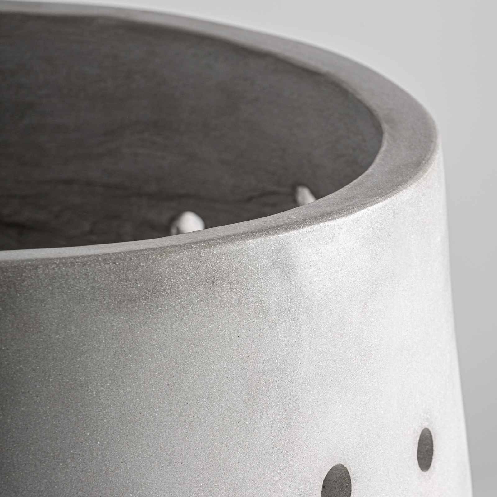 Textura brută a cimentului este pusă în valoare de perforațiile grafice dispuse ritmic, care trimit subtil la limbajul vizual al colecției Jacquard. Setul poate fi utilizat împreună pentru un impact decorativ coerent sau separat, pentru a crea continuitate vizuală în diferite zone ale spațiului.