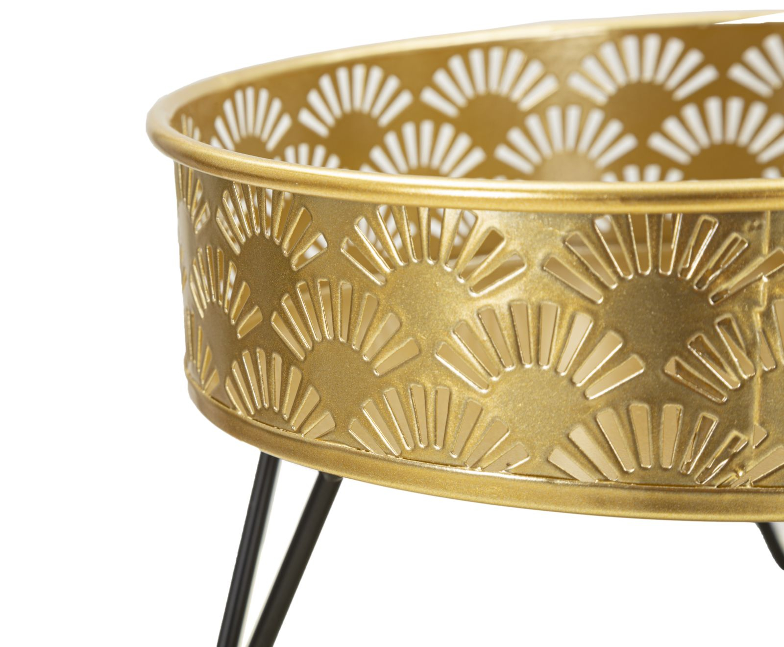 Setul de 2 suporturi de ghivece metalice Zanny, cu dimensiunile de 20,5 cm lungime, 13 cm lățime și 20,5 cm înălțime pentru primul, respectiv 18 cm lungime, 13 cm lățime și 18 cm înălțime pentru al doilea, este creat pentru a adăuga un element de sofisticare și eleganță decorului tău interior. Cu un design rafinat și un finisaj auriu, aceste suporturi sunt perfecte pentru a evidenția plantele tale într-un mod elegant și modern. Combinația dintre structura metalică neagră și detaliile aurii aduce un contrast vizual plăcut, transformând aceste suporturi într-o piesă centrală ideală pentru interioare moderne sau în stil glam. Fie că sunt utilizate în living, pe terasă sau într-un colț special amenajat, aceste suporturi vor contribui la crearea unei atmosfere sofisticate și bine organizate. Aceste suporturi de ghivece sunt disponibile acum la CreativDeco, fiind soluția ideală pentru cei care doresc să îmbogățească designul interior al casei cu un plus de eleganță și rafinament.