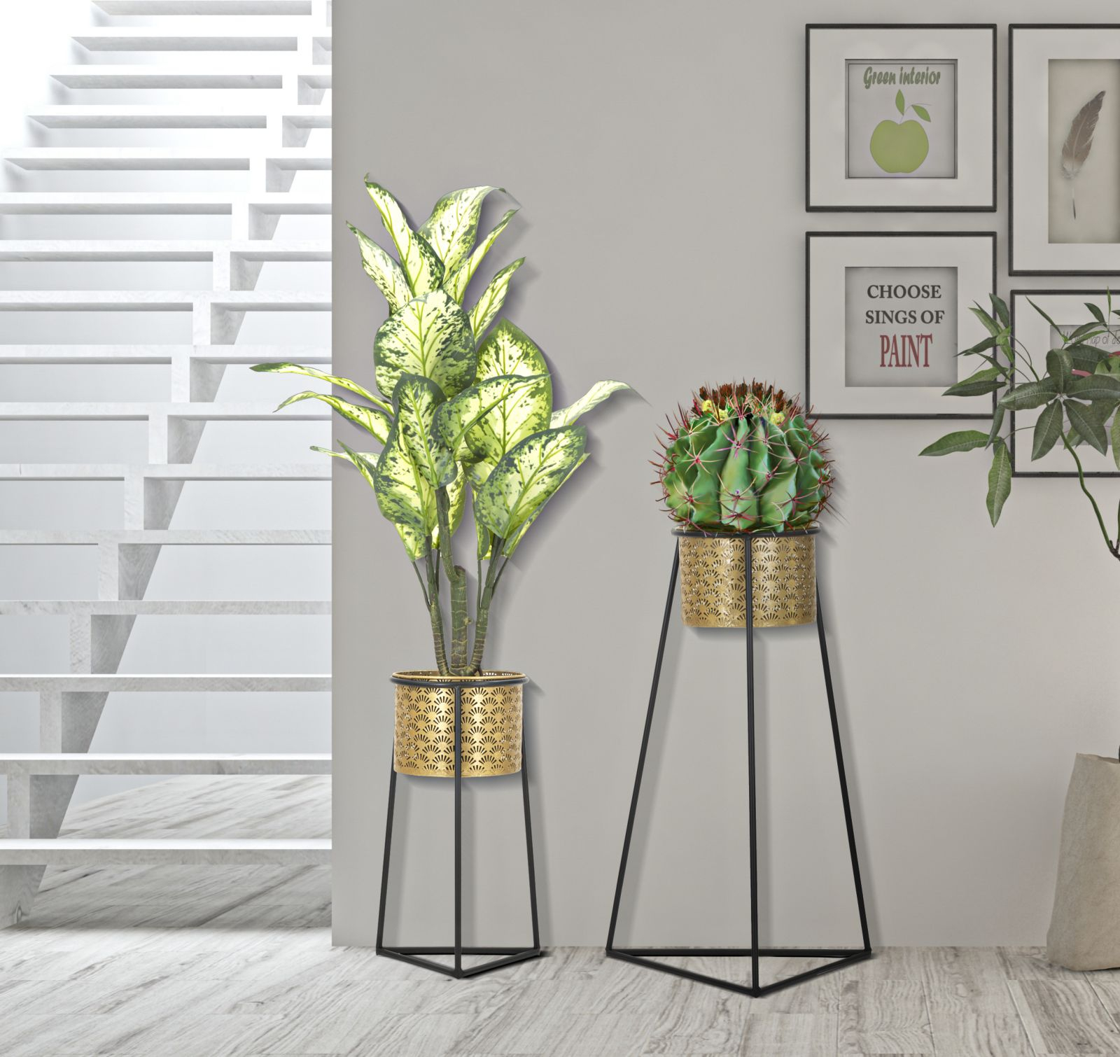 Suporturi ghivece negre cu accente aurii, ideale pentru decoruri moderne și elegante, perfect pentru a expune plantele în holuri sau sufragerii.