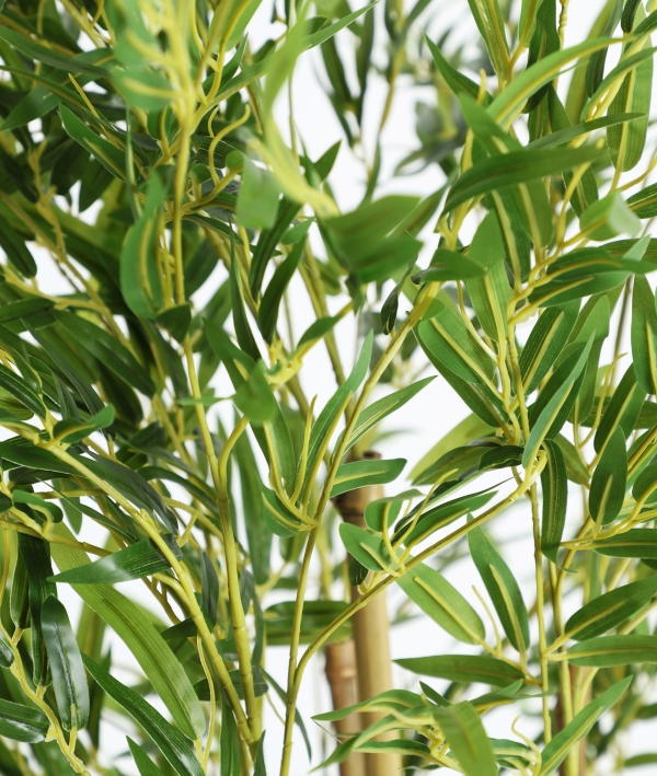 Fiecare plantă de bambus artificial este realizată cu frunze dense și variate, care imită cu fidelitate textura și dinamica bambusului natural. Trunchiurile în nuanțe calde adaugă un aspect autentic, completând armonios volumul plantei. Aspectul său vertical și subțire oferă eleganță, iar ghiveciul discret o face ușor de integrat în orice tip de suport sau cachepot.