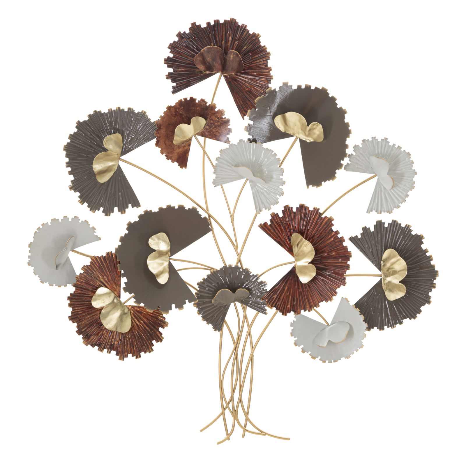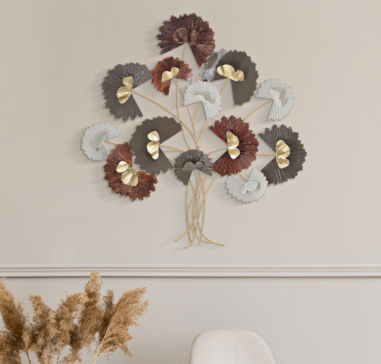 Descoperă această decorațiune de perete din metal, cu dimensiuni de 78 cm lățime și 80 cm înălțime, în stilul glam, perfectă pentru orice design interior modern sau clasic. Această decorațiune unică aduce un mix de texturi și nuanțe, incluzând maro, gri și auriu, care complementează orice paletă de culori. Designul floral stilizat, cu detalii fine și tijele auriu strălucitoare, adaugă o notă de eleganță și sofisticare, transformând-o într-un punct central impresionant în spațiul tău. Ideală pentru livinguri, birouri sau holuri, această piesă de artă metalică este o alegere excelentă pentru îmbogățirea ambientului cu un strop de lux.