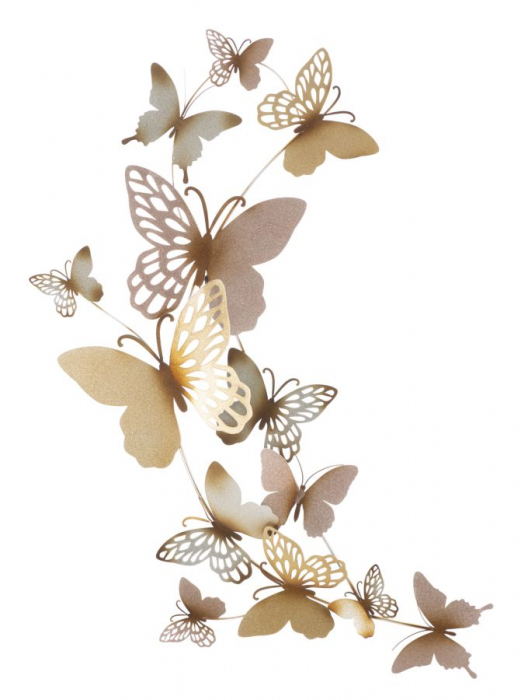 Înfrumusețează-ți spațiul cu această decorațiune de perete delicată și plină de grație, reprezentând o suită de fluturi care par să zboare liber pe peretele tău. Fiecare fluture este realizat din metal, cu detalii minuțios sculptate și finisate în nuanțe calde de auriu și crem. Această decorațiune aduce un suflu de natură și lejeritate în orice încăpere, fiind ideală pentru camera ta de zi, dormitor sau chiar hol. Lasă frumusețea și simplitatea acestor fluturi să aducă un zâmbet pe buzele oricui le privește, creând un colț de rai chiar în casa ta.