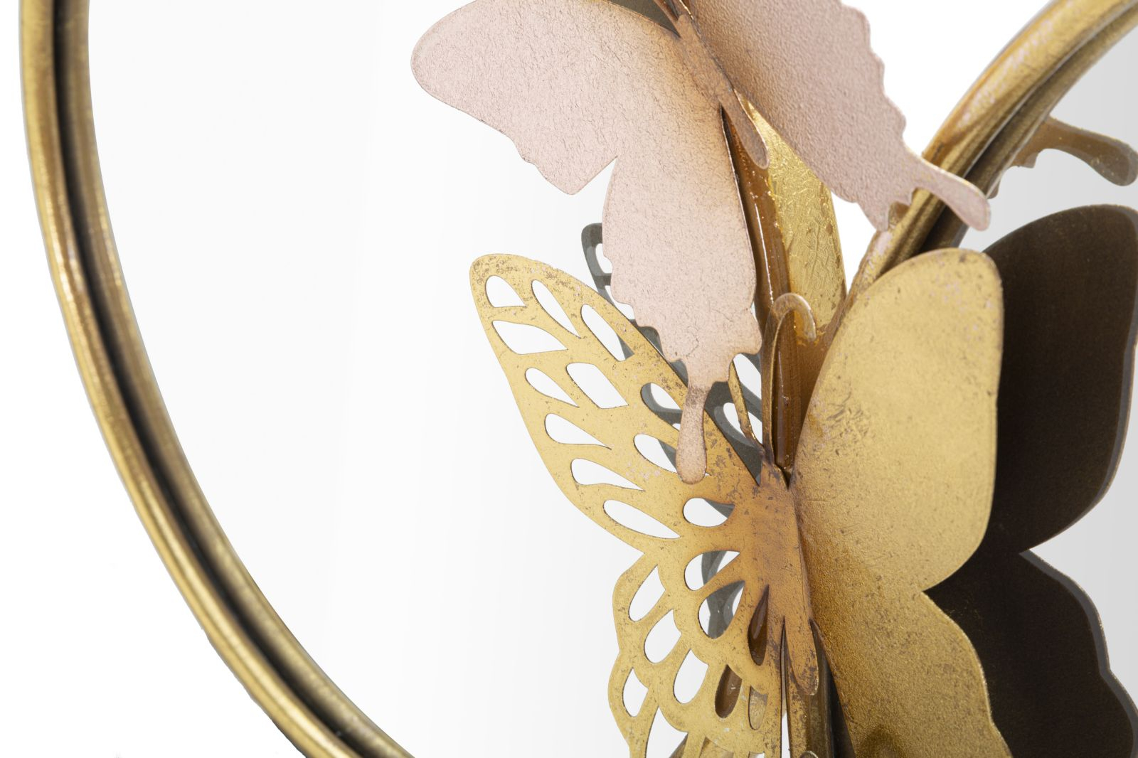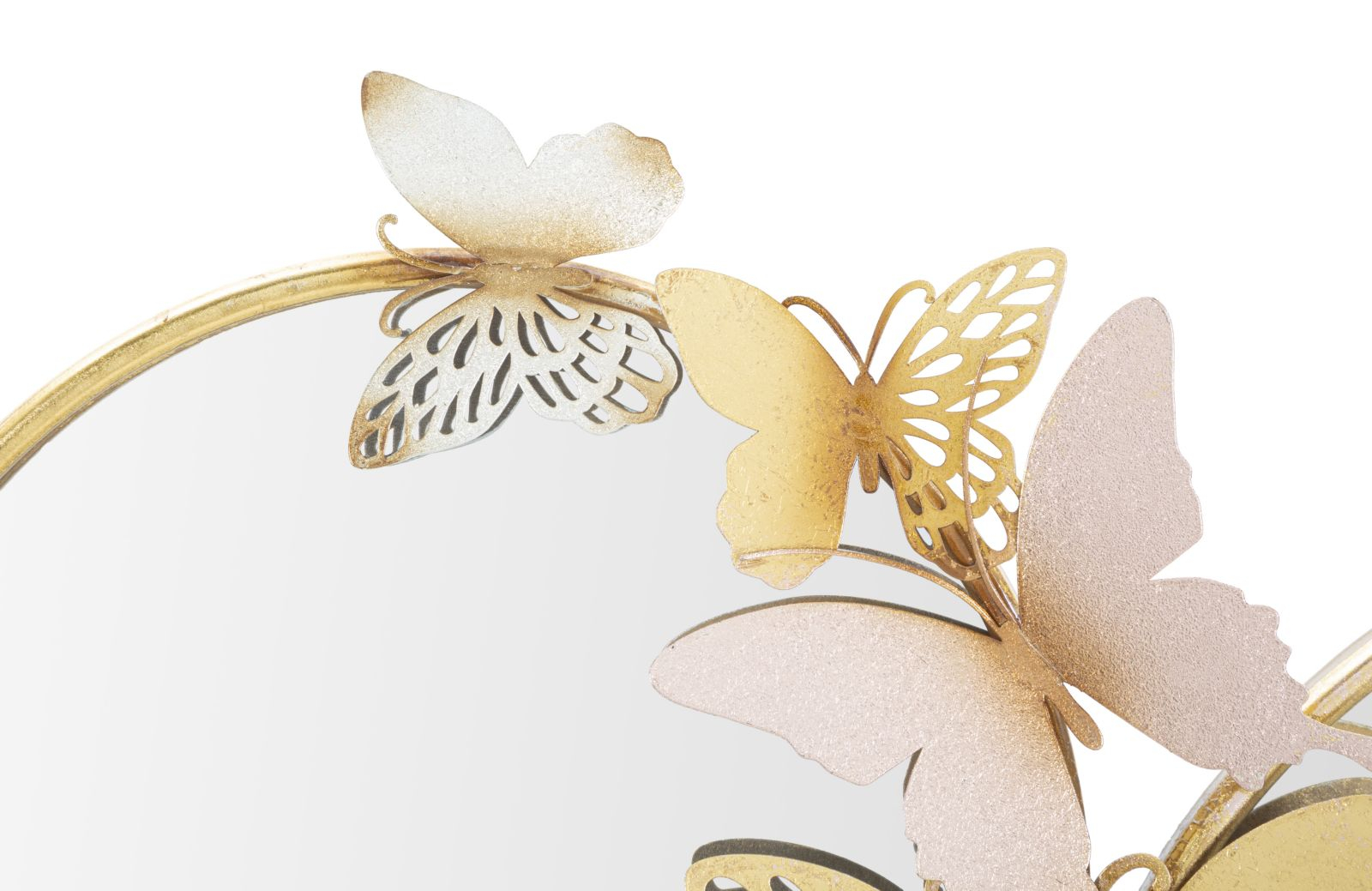 Oglindă rotundă decorativă cu fluturi 3D aurii și accente roz. Decor tematic glamour, perfect pentru dormitor sau living. Prezență vizuală puternică pe perete. Produs din colecția de toamnă 2024!