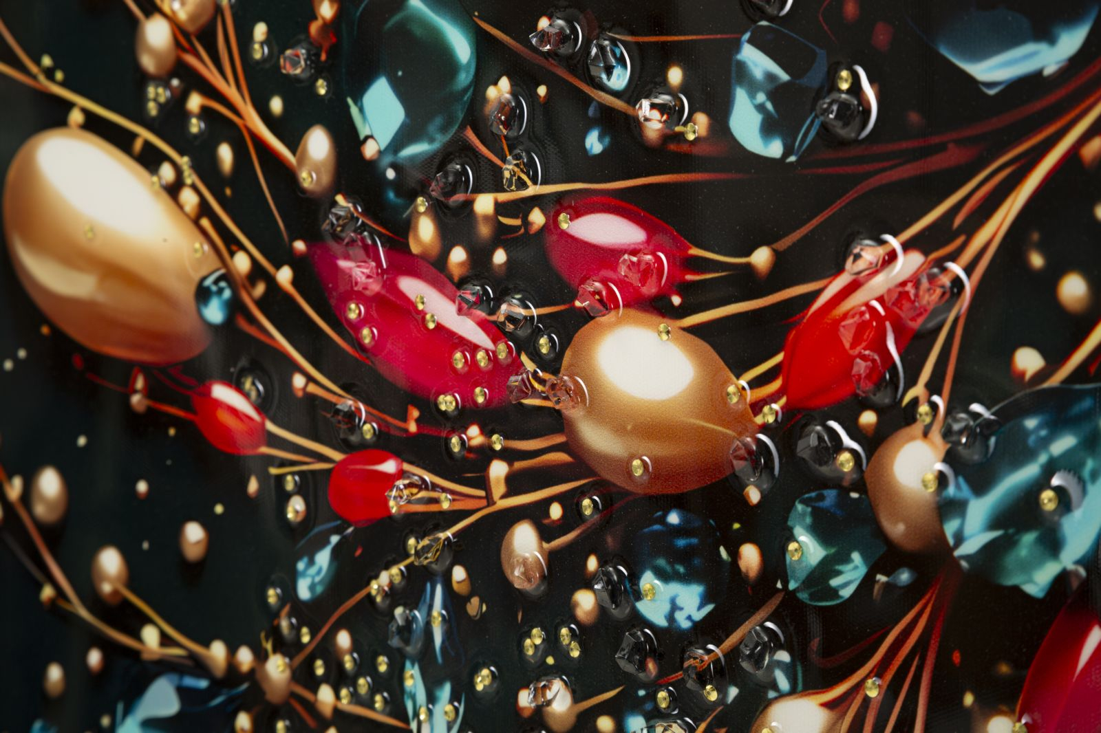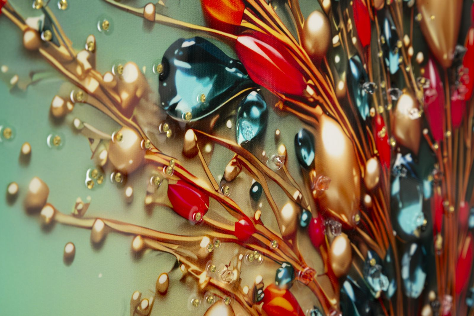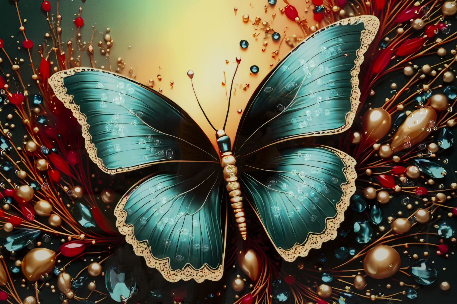 Tabloul Canvas Butterfly Laquared reda un fluture elegant in nuante turcoaz, surprins in zbor printre accente decorative bogate, in tonuri de rosu, auriu si albastru intens. Compozitia este dinamica si sofisticata, iar detaliile stralucitoare creeaza un efect vizual spectaculos, plin de energie si rafinament.