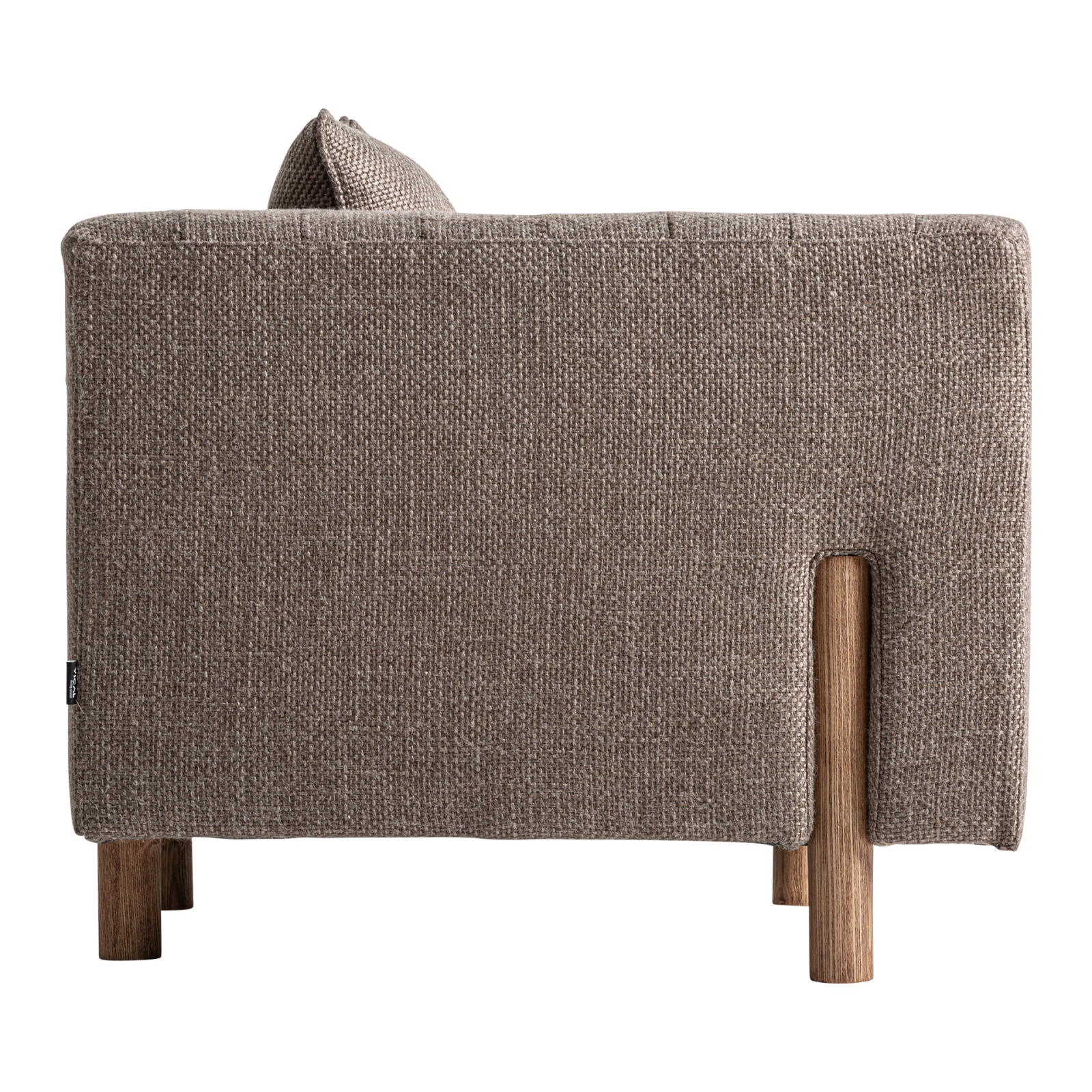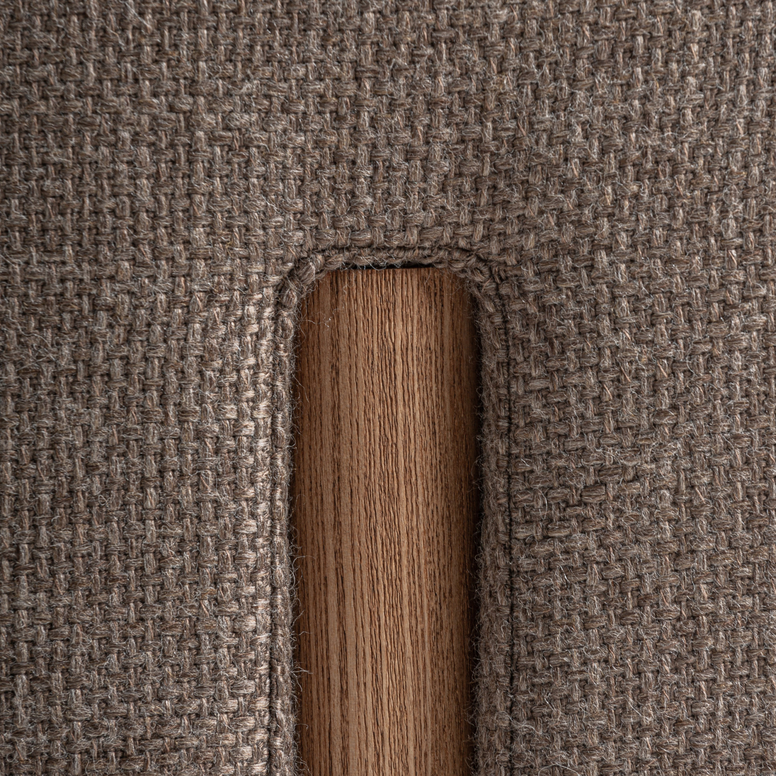 Tapiseria în nuanțe de gri texturat oferă profunzime și versatilitate, în timp ce structura din lemn în ton cald adaugă naturalețe. Detaliile capitonate discret pe lateralul spătarului aduc un plus de caracter, fără să încarce vizual.