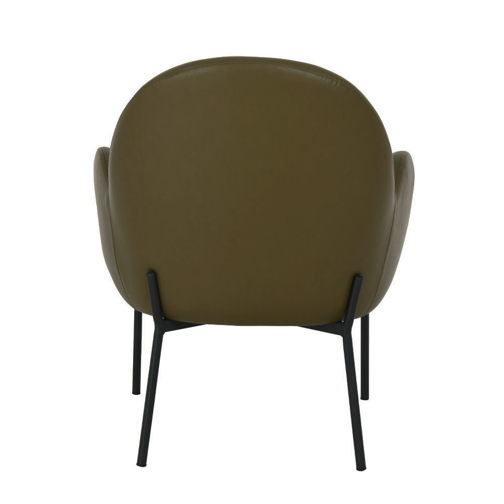 Tapițeria din piele ecologică într-o nuanță sofisticată de verde oferă un aspect modern și ușor de întreținut, păstrând în același timp eleganța vizuală. Forma curbată a spătarului și brațele rotunjite creează o siluetă fluidă, plăcută și primitoare.