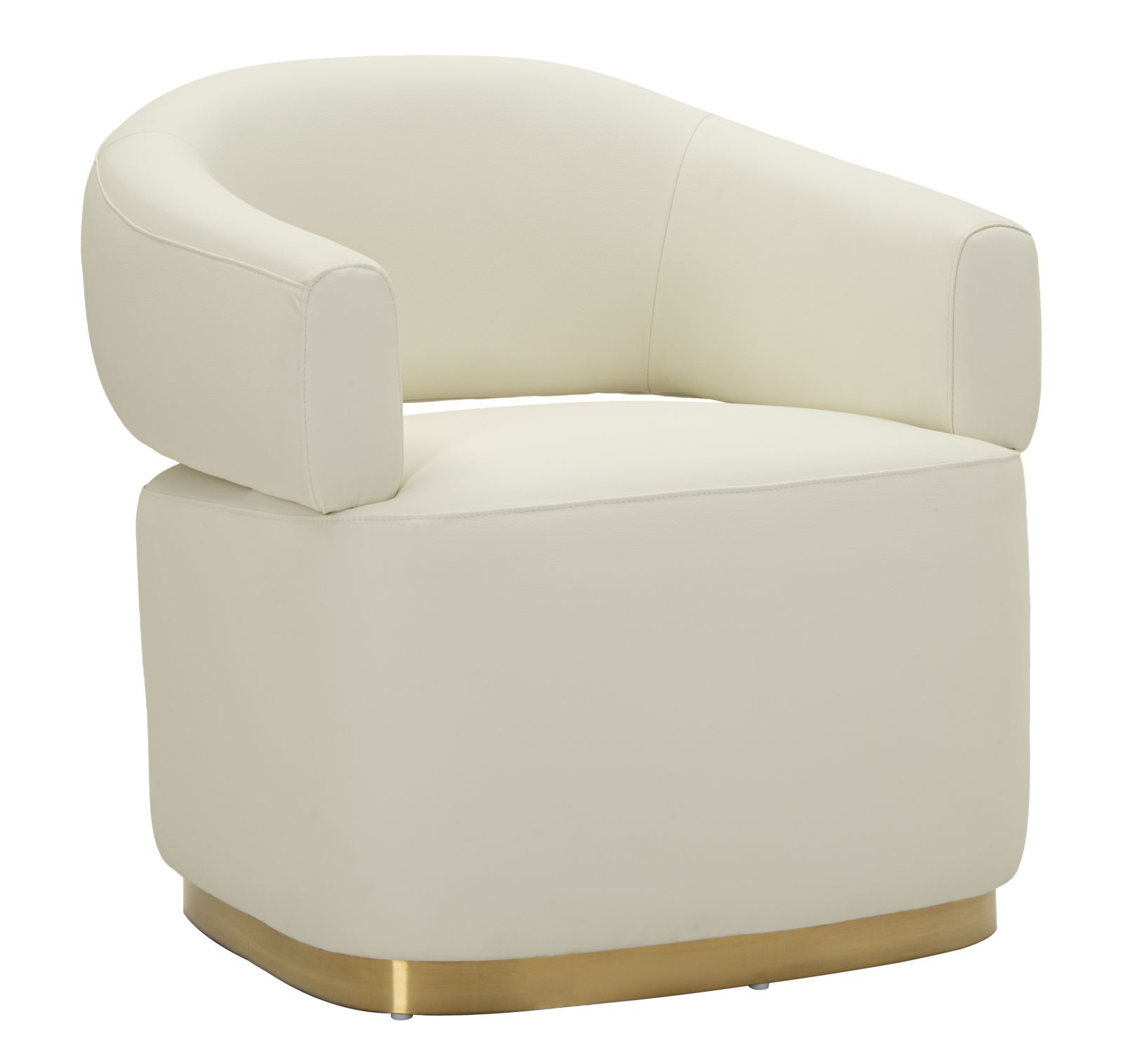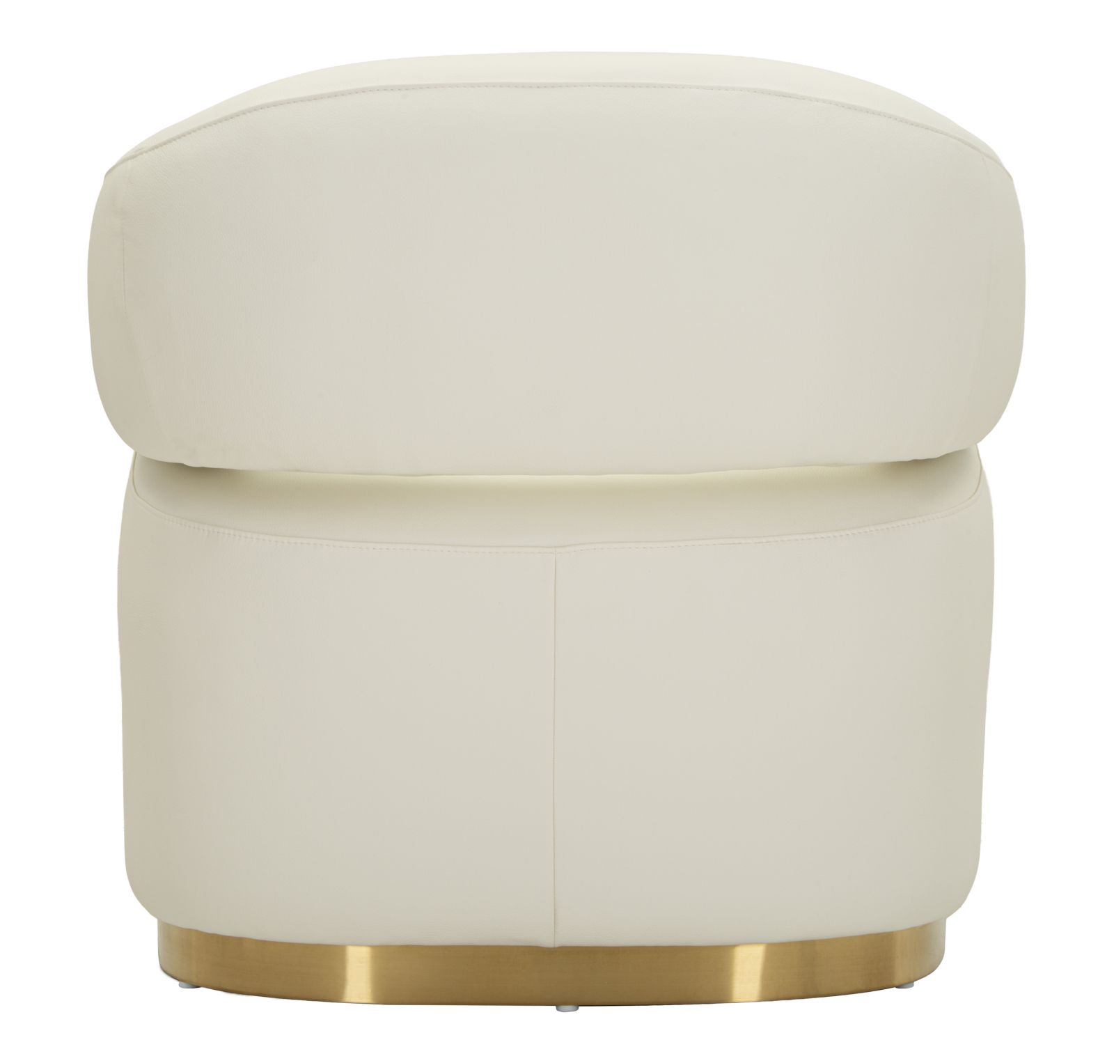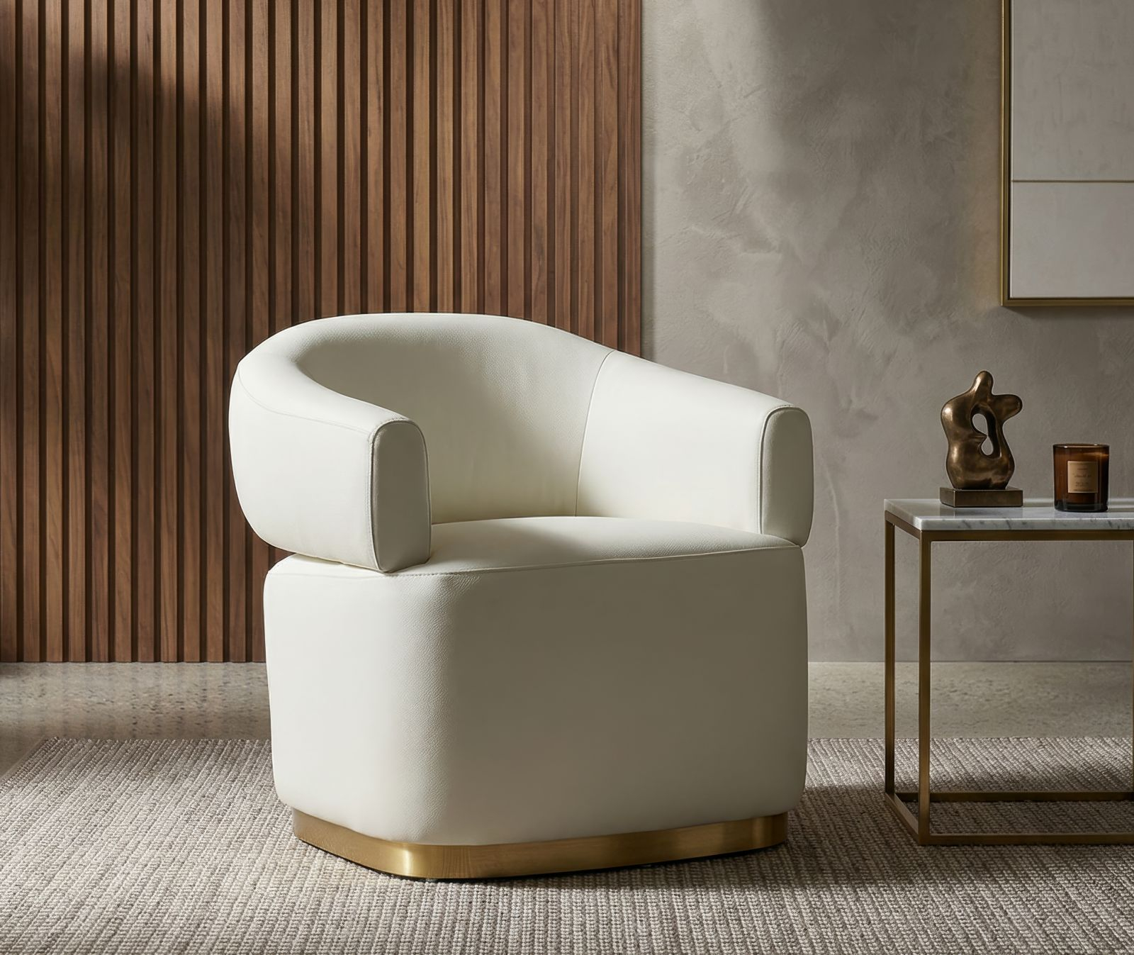 Tapițeria albă aduce luminozitate și eleganță spațiului, iar baza metalică aurie accentuează designul luxos al piesei. Liniile fluide ale spătarului și brațelor creează un efect vizual plăcut și o experiență de ședere confortabilă.
