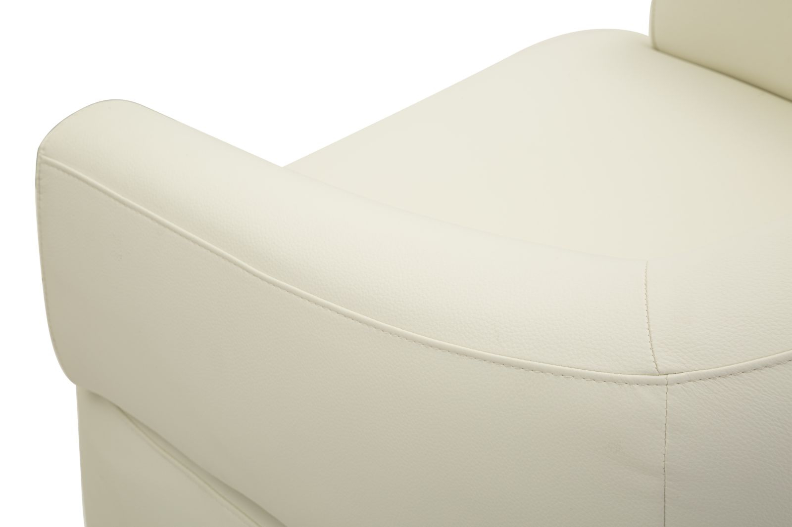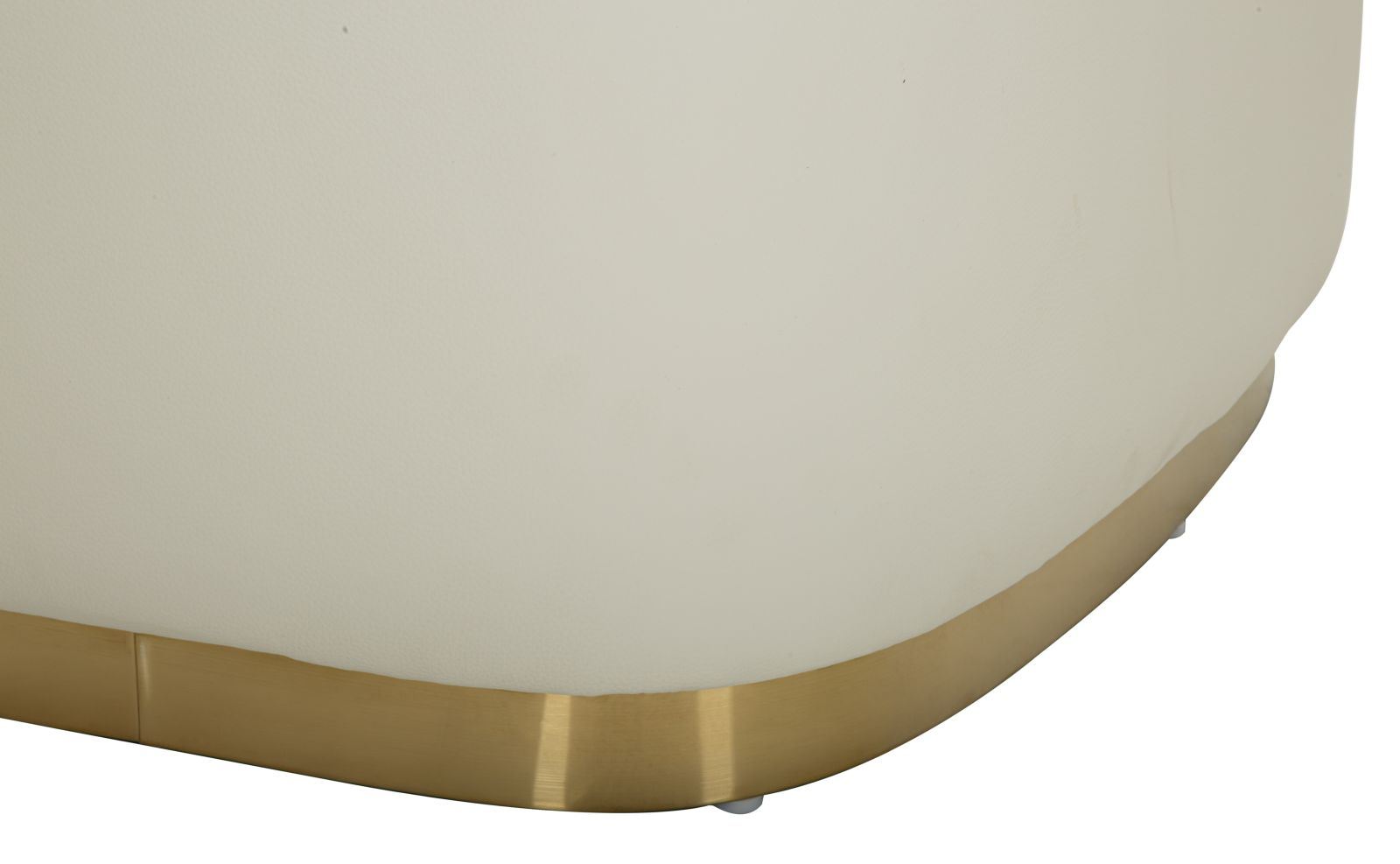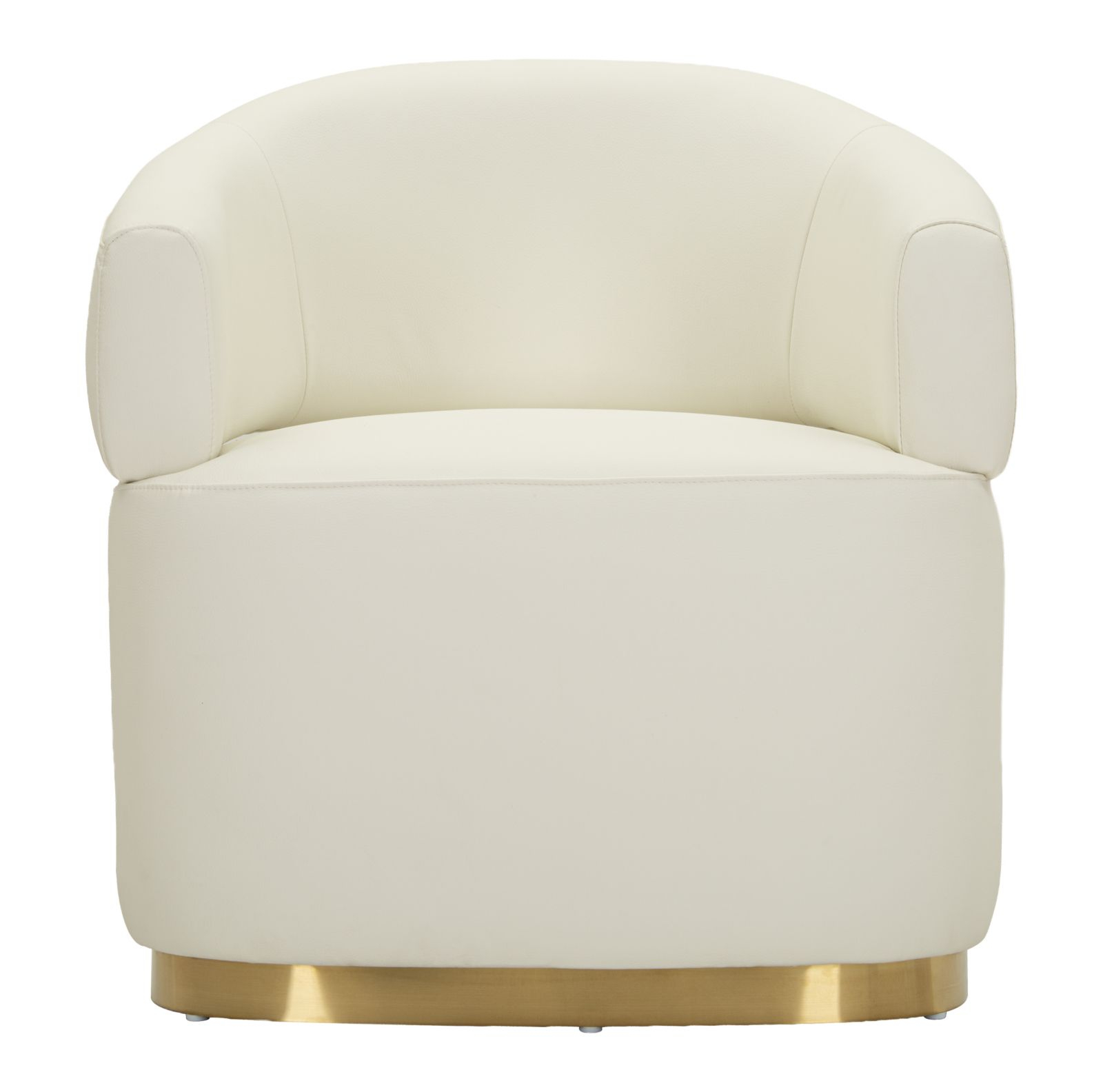 Tapițeria albă aduce luminozitate și eleganță spațiului, iar baza metalică aurie accentuează designul luxos al piesei. Liniile fluide ale spătarului și brațelor creează un efect vizual plăcut și o experiență de ședere confortabilă.