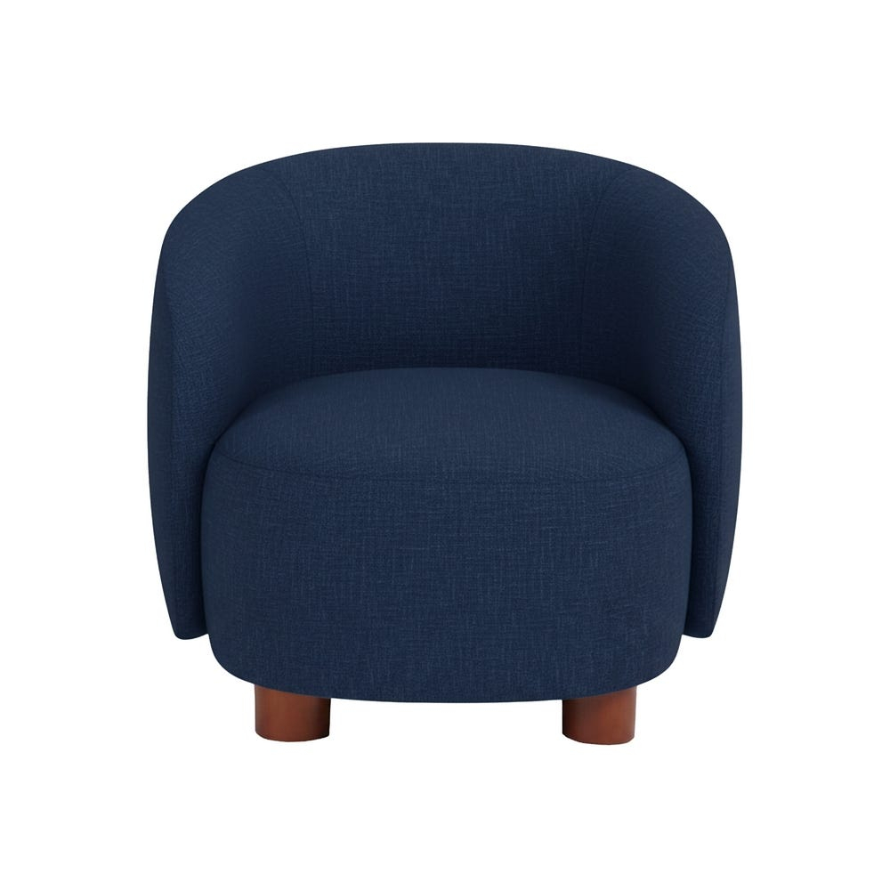 Șezutul și spătarul sunt tapitate cu stofă din poliéster, iar umplutura din spumă susține forma rotunjită a fotoliului. Tapițeria albastră este uniformă și evidențiază liniile fluide ale piesei, oferind o prezență vizuală calmă și stabilă.