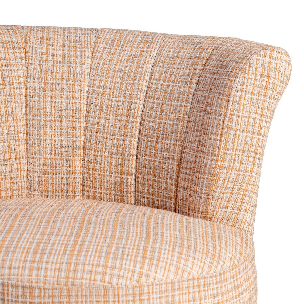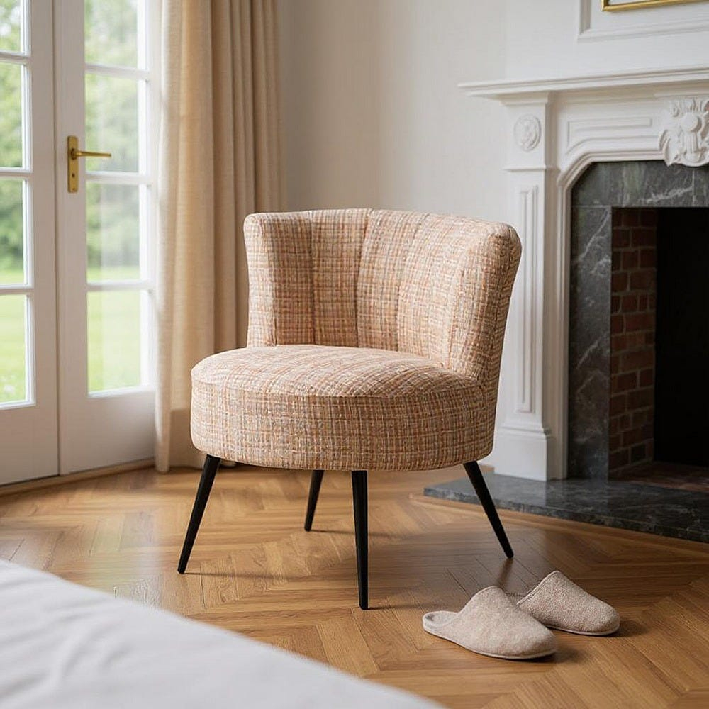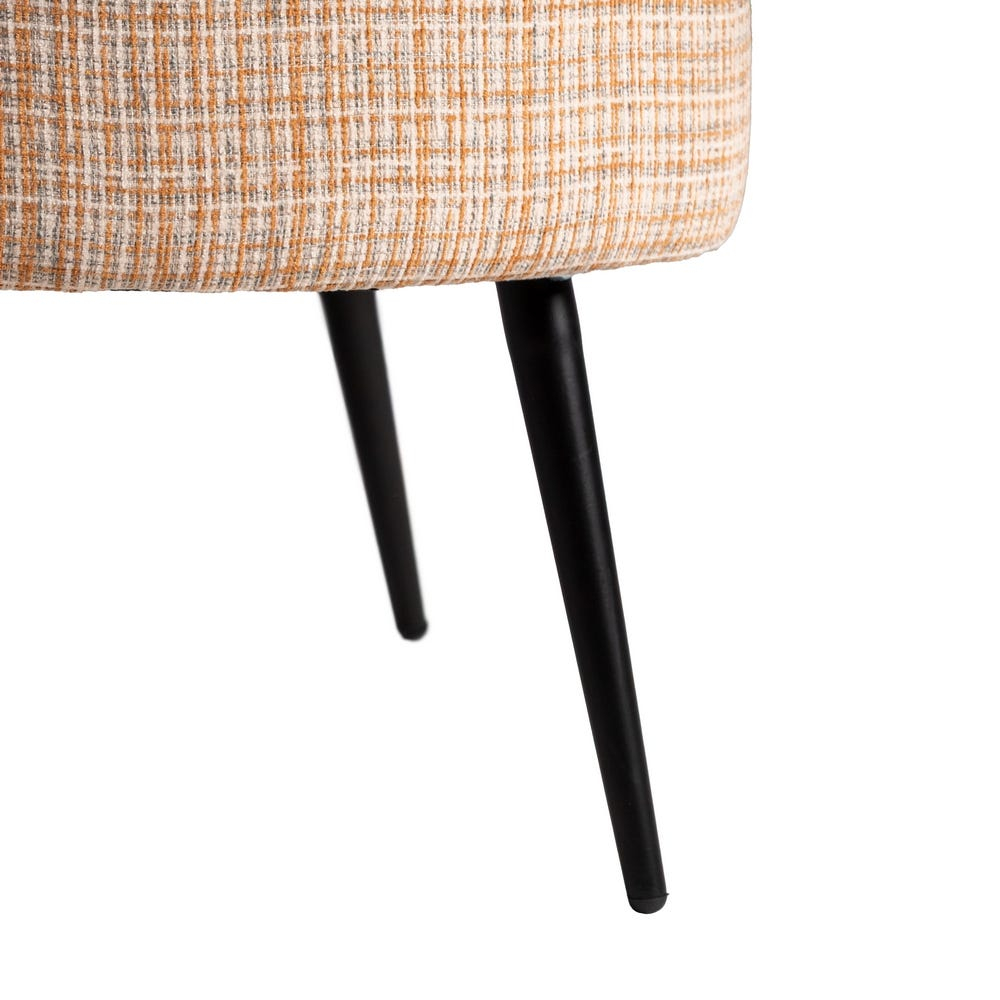 Fotoliul bej din stofă cu picioare metalice în stil scandinav combină liniile simple și echilibrate cu un confort plin de căldură. Spătarul curbat și șezutul rotund creează o formă compactă și elegantă, ideală pentru spații mici sau zone de relaxare discrete.