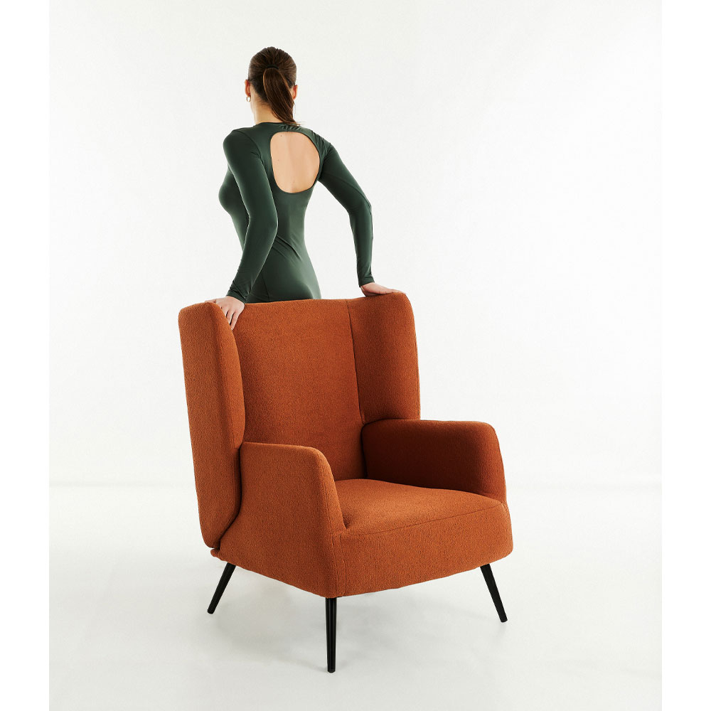 Fotoliul din material textil cărămiziu cu picioare negre în stil contemporan este o piesă elegantă cu spătar înalt și linii ferme, concepută pentru confortul zilnic și un impact vizual puternic. Forma sa cu brațe largi și colțuri rotunjite creează o prezență armonioasă în orice living modern sau colț de lectură cald și primitor.