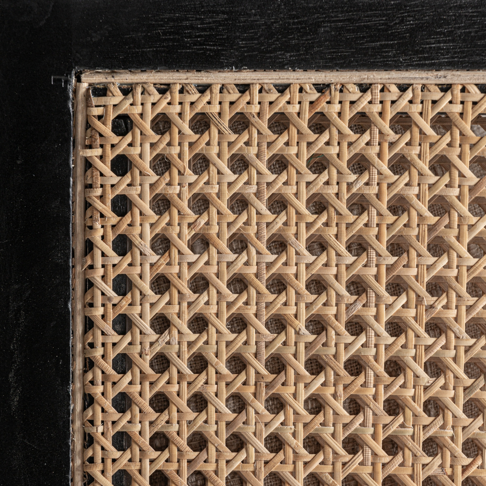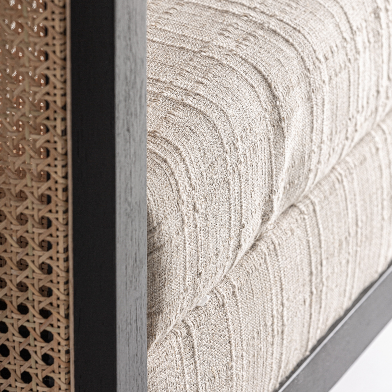 Designul său pune accent pe jocul de materiale și proporții: cadrul geometric, bine definit, susține panourile laterale din ratan care adaugă transparență vizuală și lejeritate. Tapițeria textilă în nuanțe de crem completează armonios ansamblul, oferind confort și o senzație plăcută la atingere.