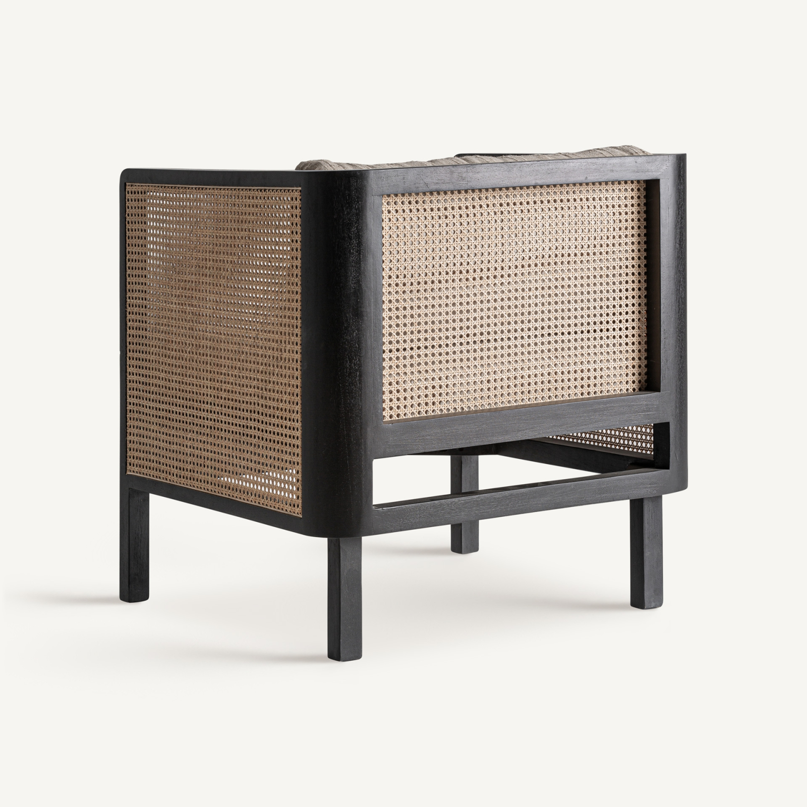 Fotoliul Kaleb de la VICAL este o piesă cu un design echilibrat, care îmbină estetica contemporană cu detalii inspirate din mobilierul artizanal. Structura fermă din lemn de mango finisat în negru contrastează elegant cu textura naturală a panourilor din ratan și cu tapițeria deschisă la culoare, creând o prezență calmă și primitoare în orice interior.