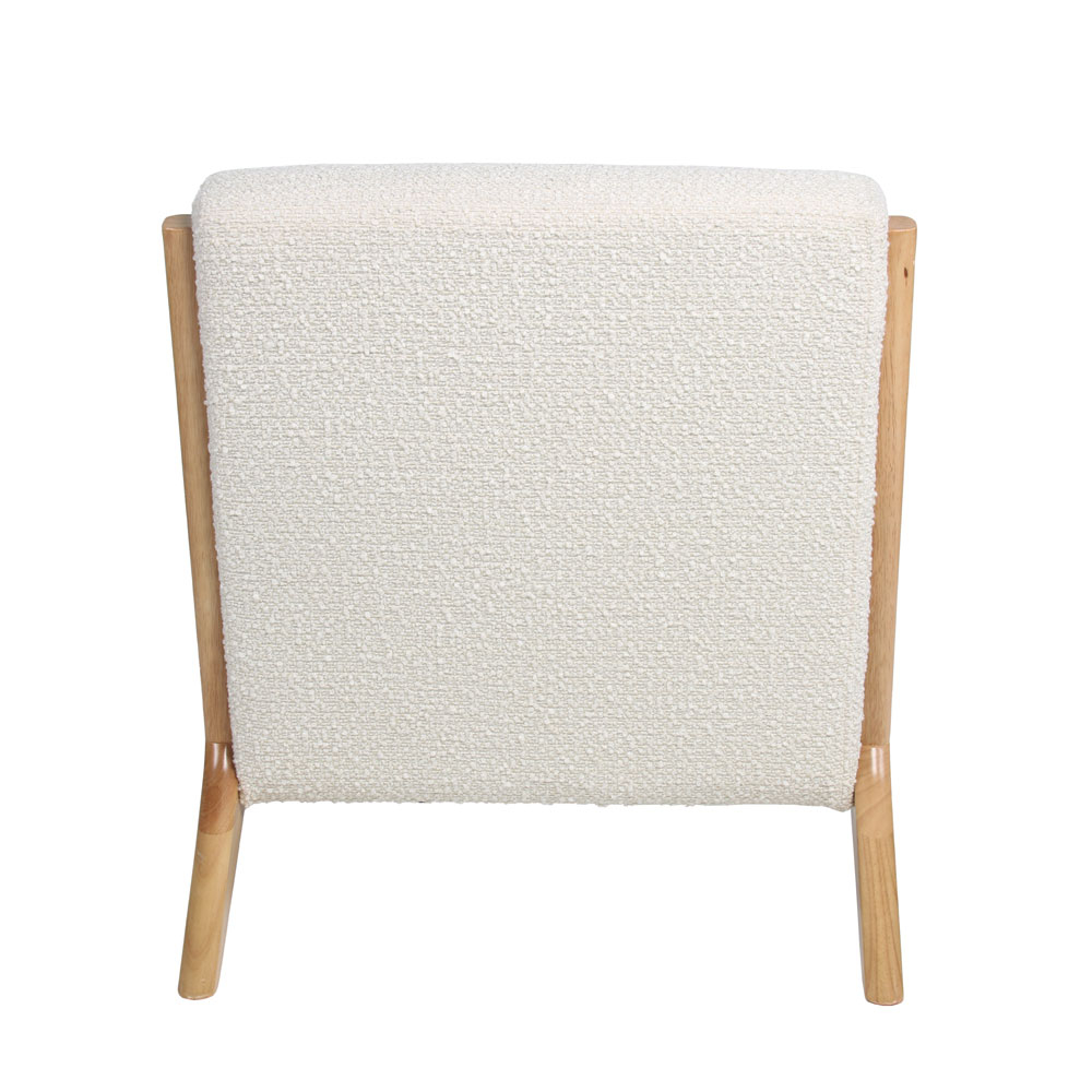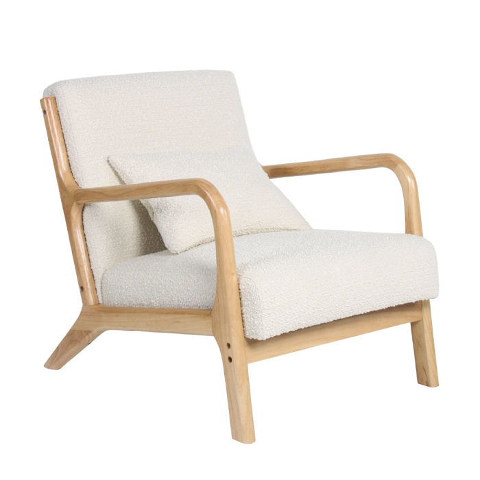 Fotoliul are structură din lemn masiv rubberwood și tapițerie din bouclé, 100% fibră poliester.