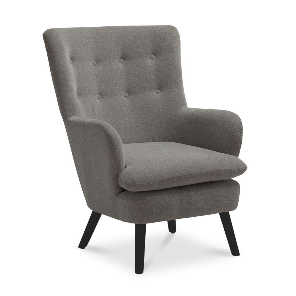 Tapițat în stofă chenille gri, cu textură moale și plăcută la atingere, fotoliul oferă o senzație de confort autentic. Spătarul înalt, decorat cu nasturi subtili, și brațele generoase creează o siluetă armonioasă care invită la relaxare prelungită.