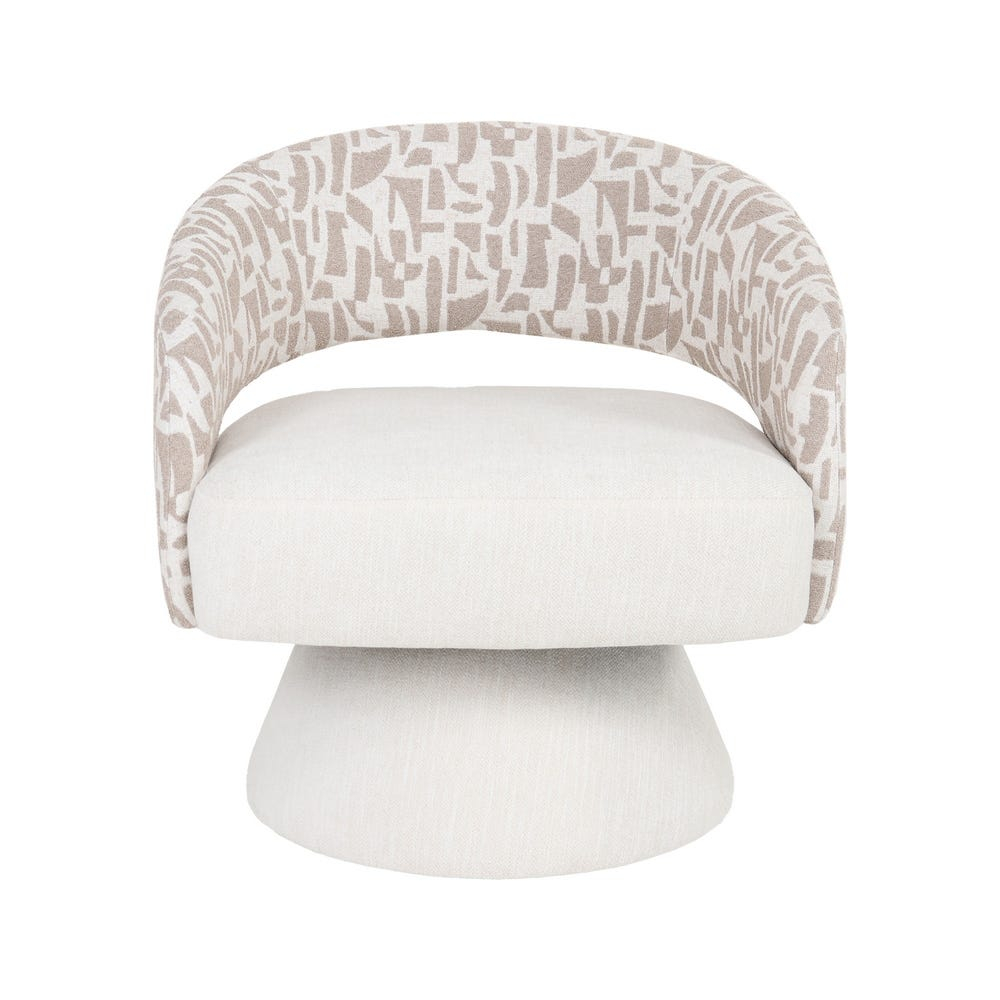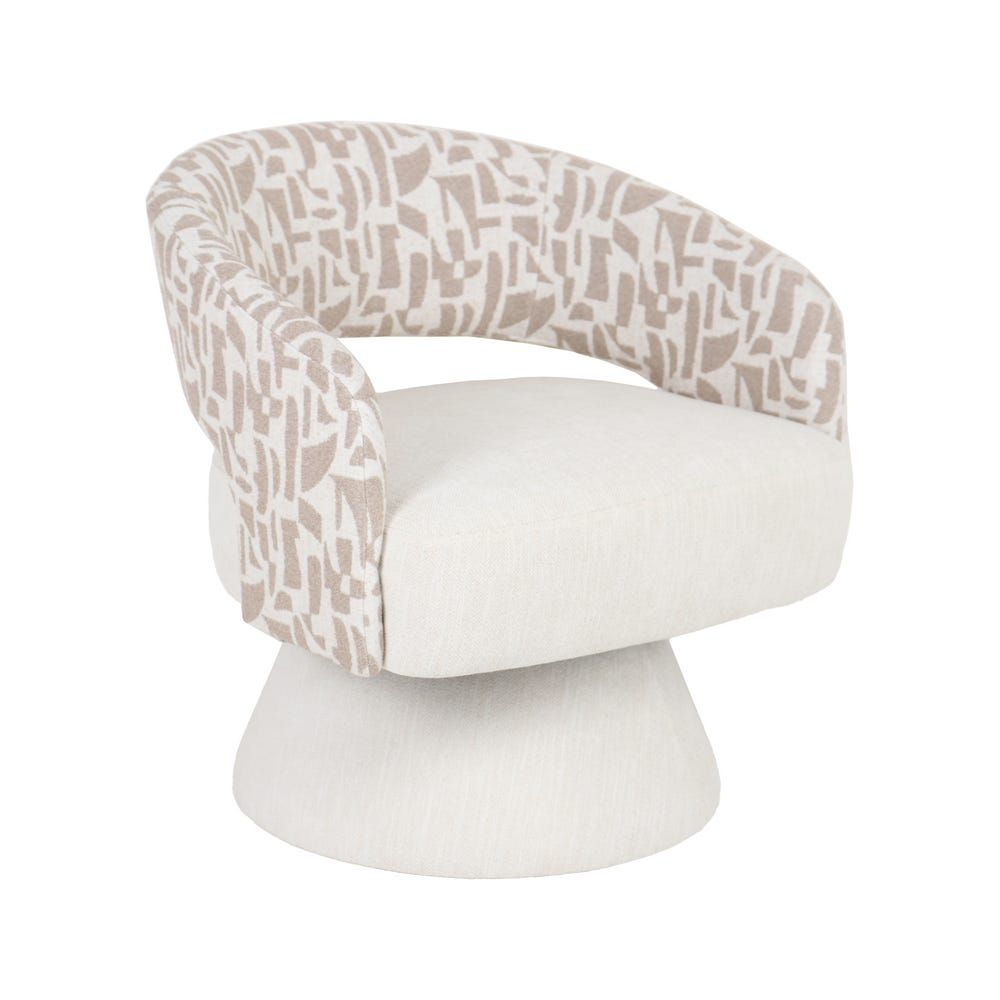 Acest fotoliu rotativ se remarcă printr un joc vizual subtil între nuanțele crem și bej, pus în valoare de formele sale ample și curbe. Designul său este gândit pentru interioare în care culoarea și textura contribuie la atmosfera generală, transformând piesa într un element de accent cu prezență distinctă.