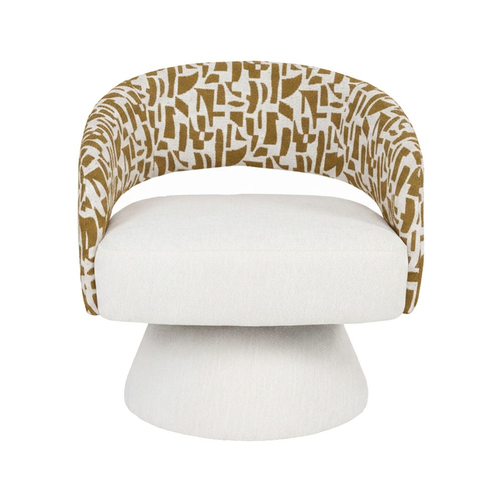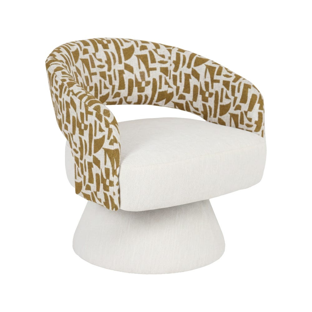 Acest fotoliu rotativ se evidențiază printr un contrast cromatic expresiv între nuanța crem a șezutului și ocrul decorativ al spătarului. Forma sa amplă, cu spătar curbat și brațe integrate, creează o piesă de accent potrivită pentru amenajări interioare care valorifică textura și jocul de culori.