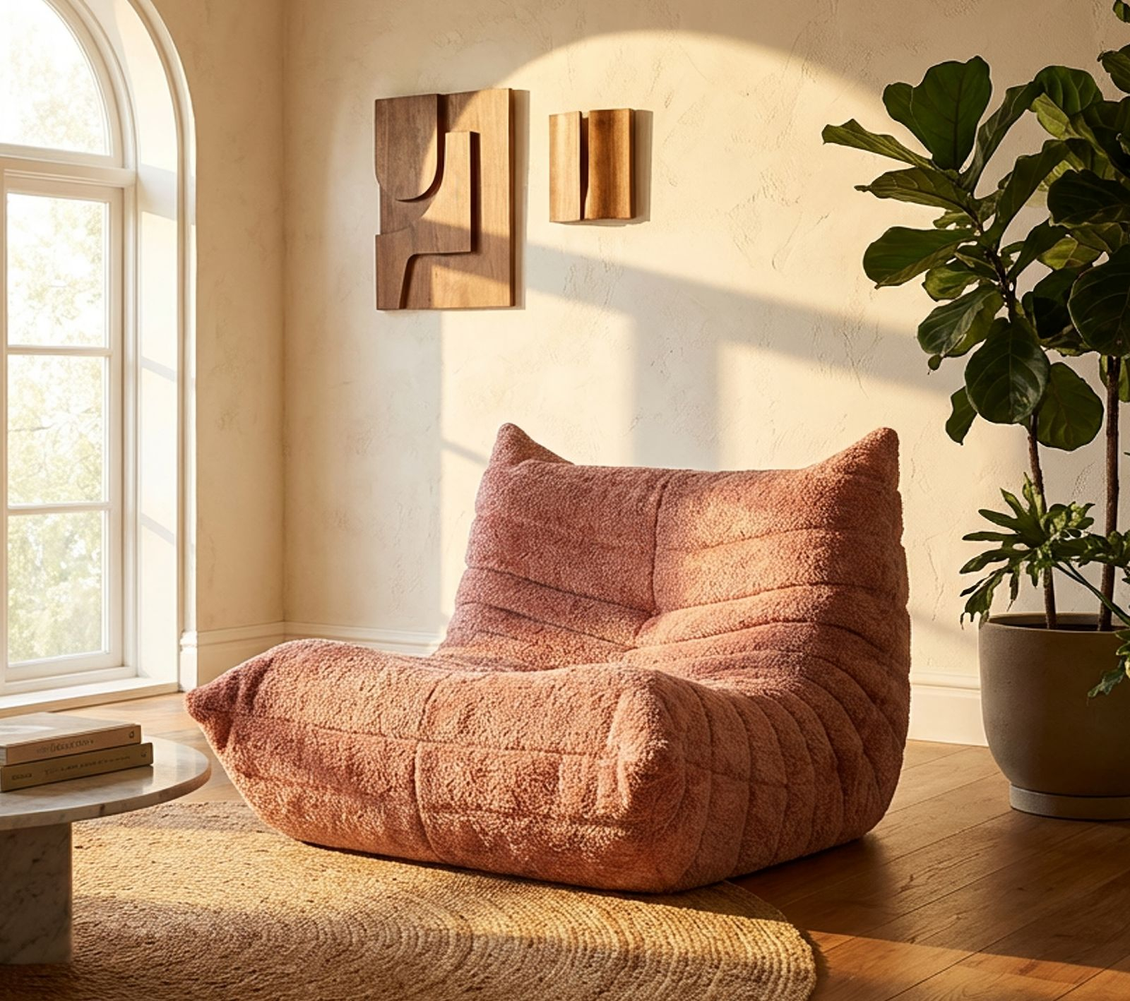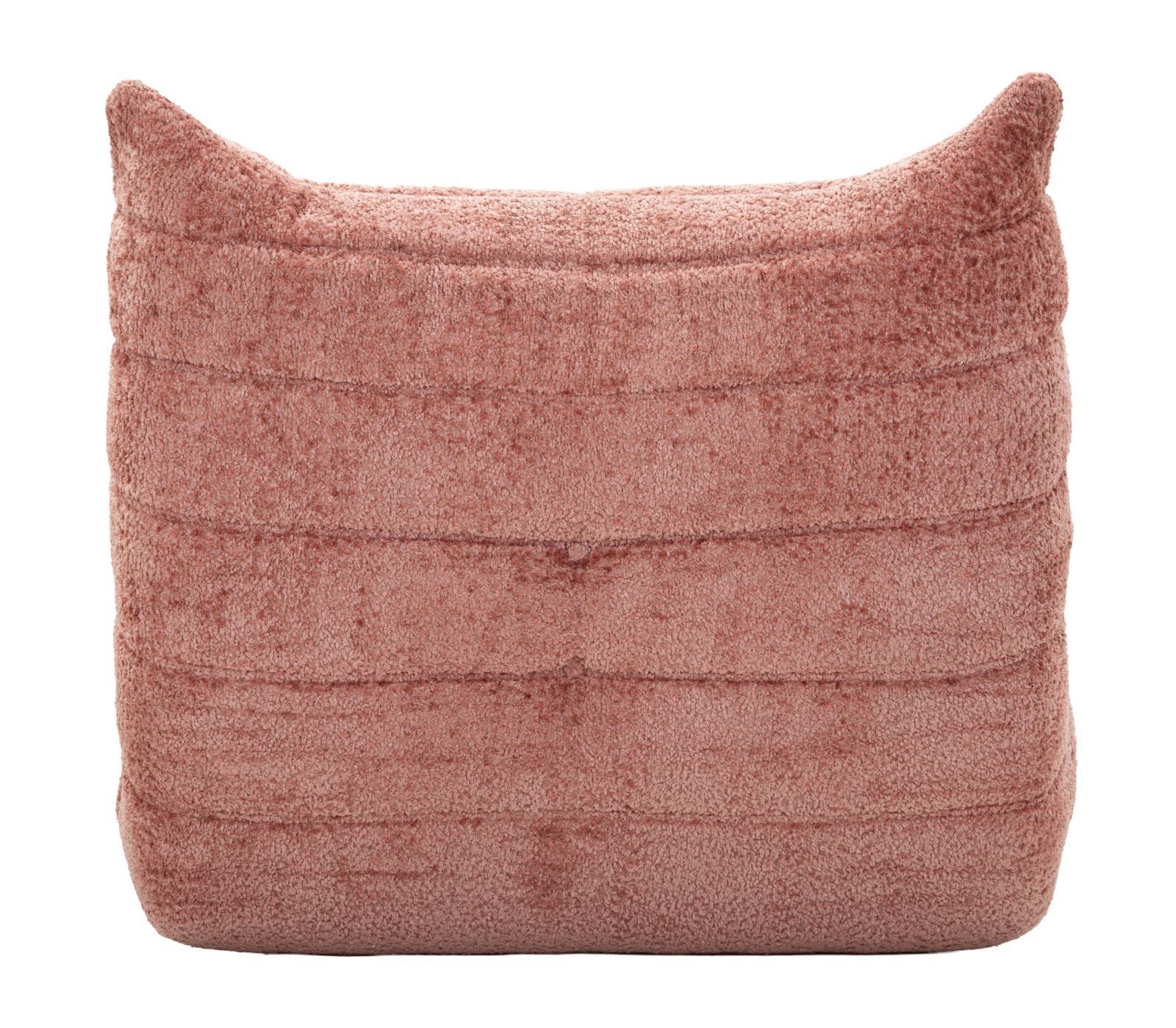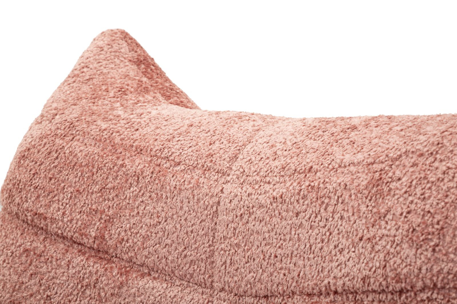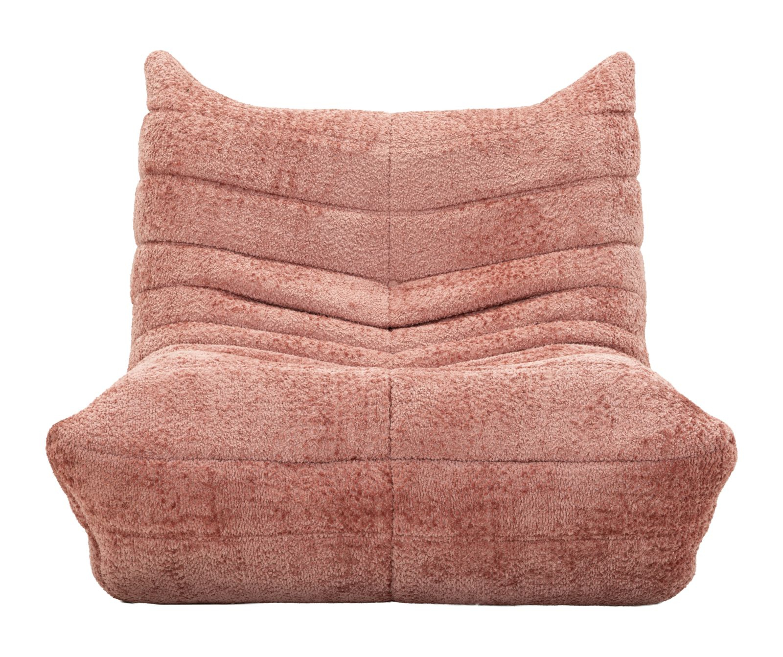 Designul învăluitor și proporțiile generoase definesc o siluetă echilibrată, în care șezutul amplu și spătarul integrat formează un ansamblu coerent din punct de vedere vizual. Cusăturile orizontale evidențiază liniile curbe și accentuează caracterul sculptural al piesei, în timp ce nuanța de roz adaugă căldură și rafinament spațiului.