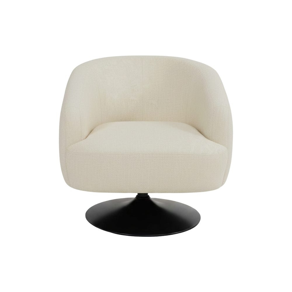 Acest fotoliu tapitat în nuanță crem este conceput pentru amenajări interioare care urmăresc simplitatea formelor și o prezență vizuală calmă. Volumul compact, spătarul curbat cu brațe integrate și baza metalică creează o piesă echilibrată, potrivită ca element de accent sau ca parte a unei zone de relaxare bine definite.