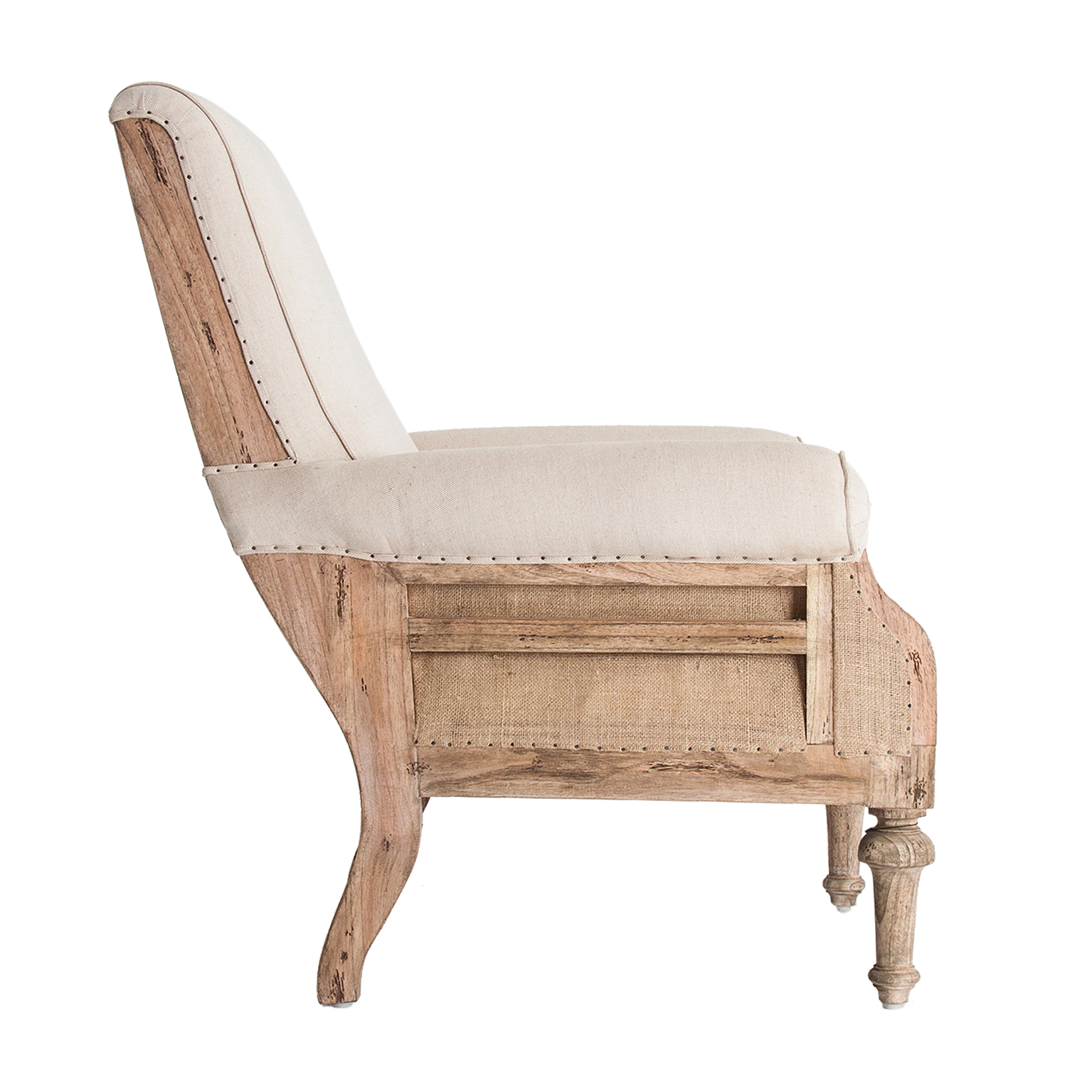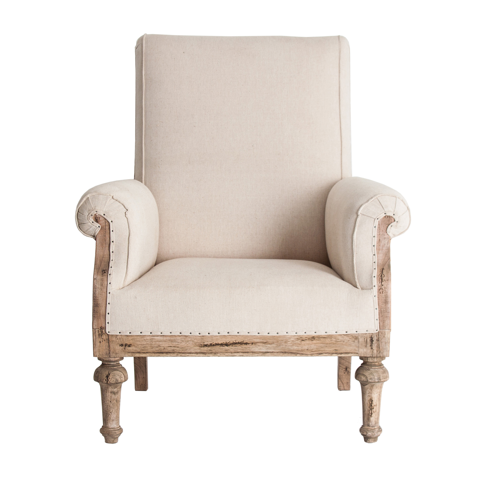 Fotoliu crem stil shabby chic din lemn tropical și poliester. Design vintage, aspect rustic. Fotolii decorative, accent confortabil.