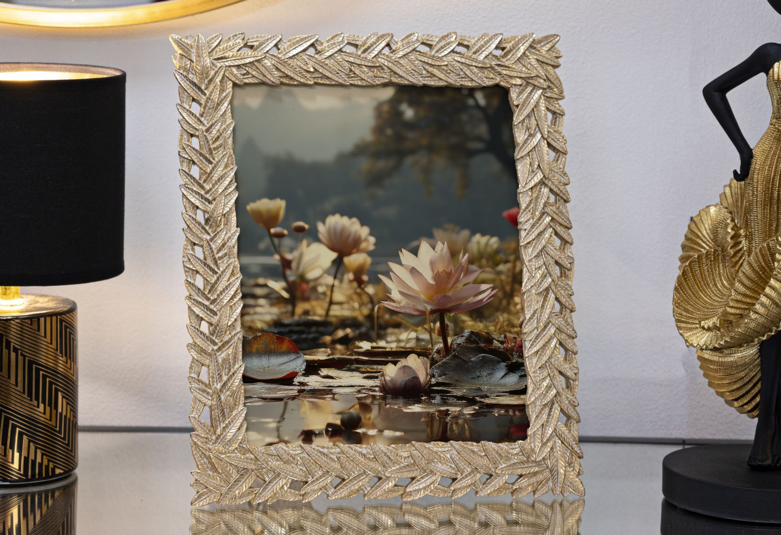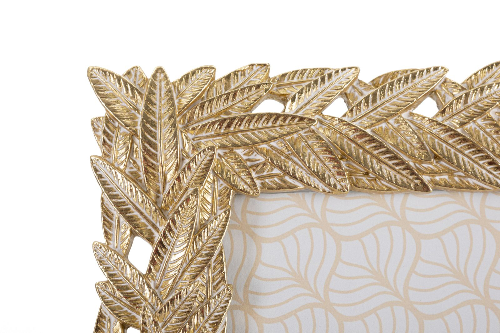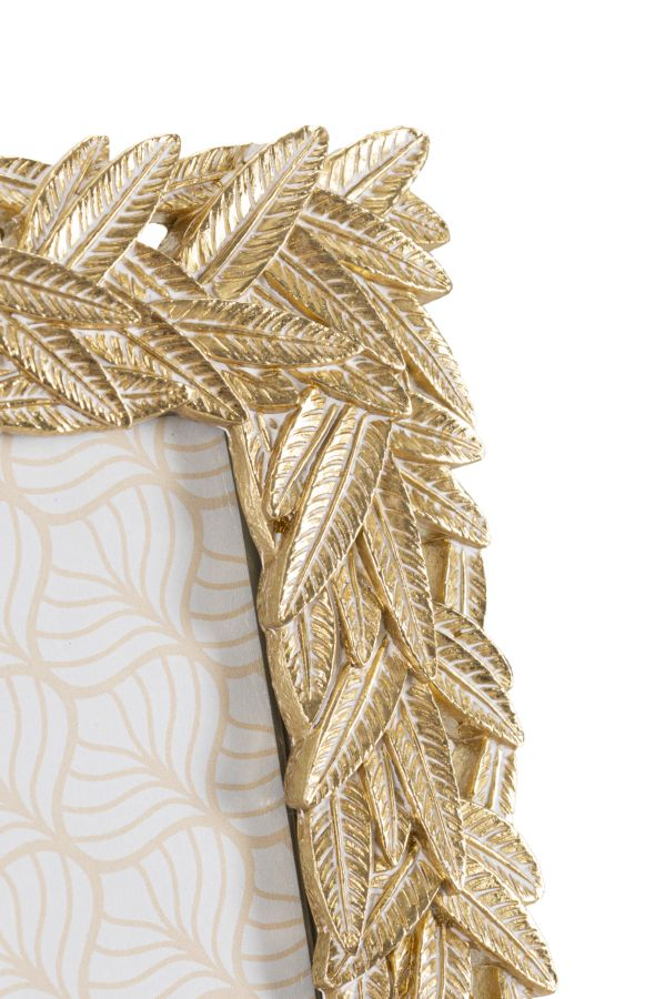 Transforma-ti livingul intr-o oaza de natura cu rama foto aurie decorata cu frunzulite delicate. Protejeaza amintirile pretioase si creeaza un decor sofisticat. Achizitioneaza acum si adauga un strop de eleganta naturala in casa ta!