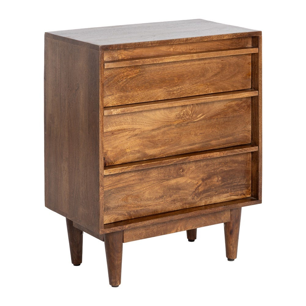 Proporțiile compacte se combină cu picioarele conice de inspirație mid-century, astfel încât volumul pare ușor și bine ancorat. Rama subțire care înconjoară fațadele scoate în evidență fibra lemnului de mango, în timp ce mânerele integrate oferă o prindere comodă fără a fragmenta desenul natural al lemnului. Rezultatul este o piesă cu spirit scandinav: curată, funcțională și caldă.