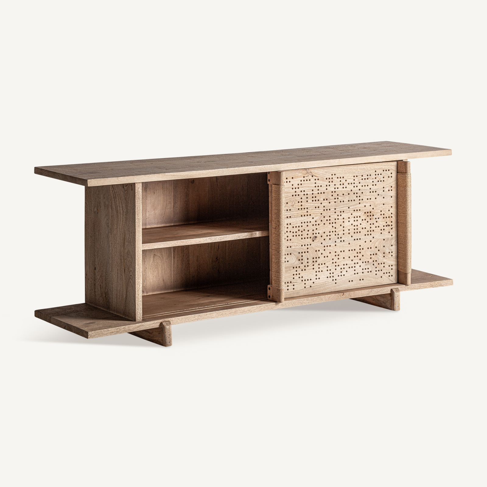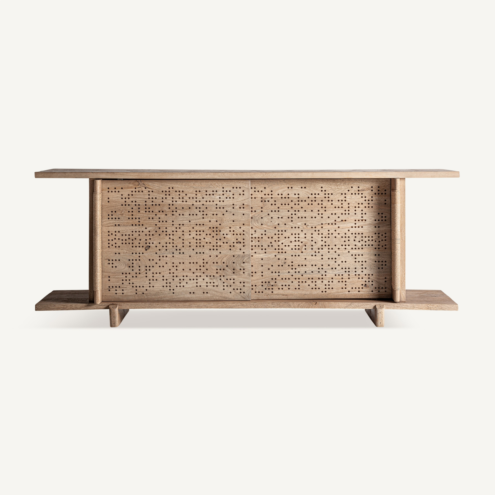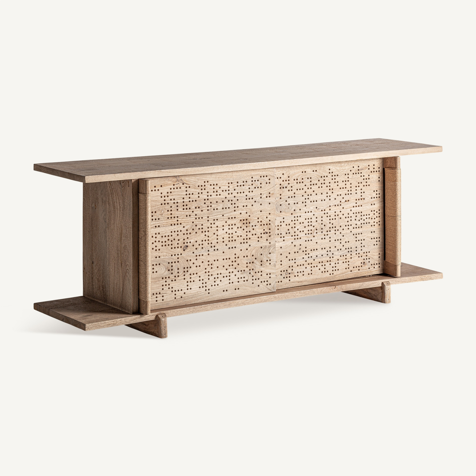 Fronturile comodei sunt decorate cu un model perforat realizat direct în masa lemnului, inspirat din grafica țesăturilor jacquard. Acest detaliu decorativ adaugă profunzime și ritm suprafeței, transformând piesa într-un element sculptural, în care textura devine parte esențială a designului. Sistemul de uși glisante păstrează un aspect curat și fluid, fără a fragmenta vizual volumul.