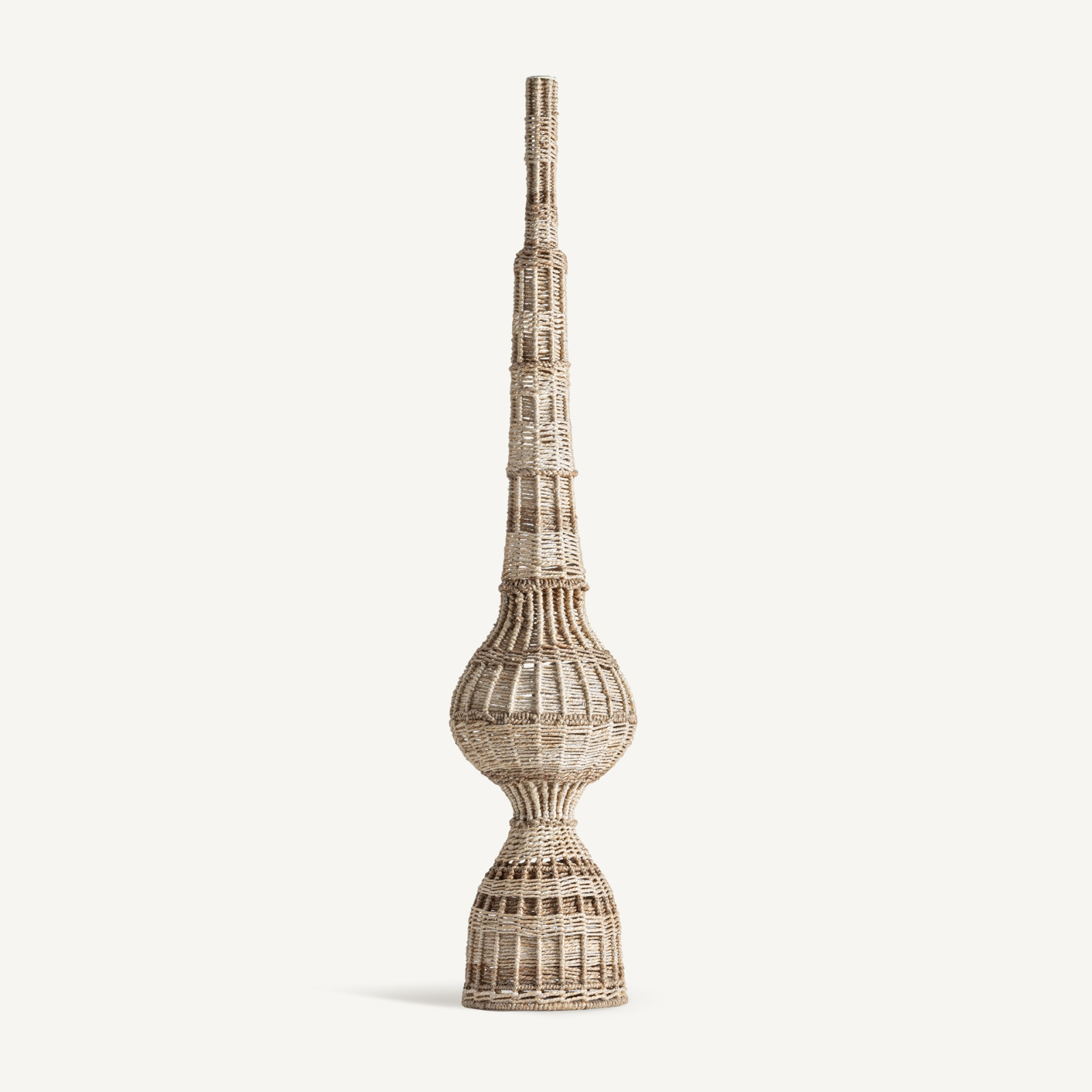 Cu o siluetă înaltă și o compoziție vizuală puternică, această lampă de podea din iută devine un element decorativ statement în amenajările interioare. Forma sa alungită, construită din volume succesive, creează un impact vizual vertical accentuat, potrivit spațiilor care permit punerea în valoare a pieselor de mari dimensiuni.