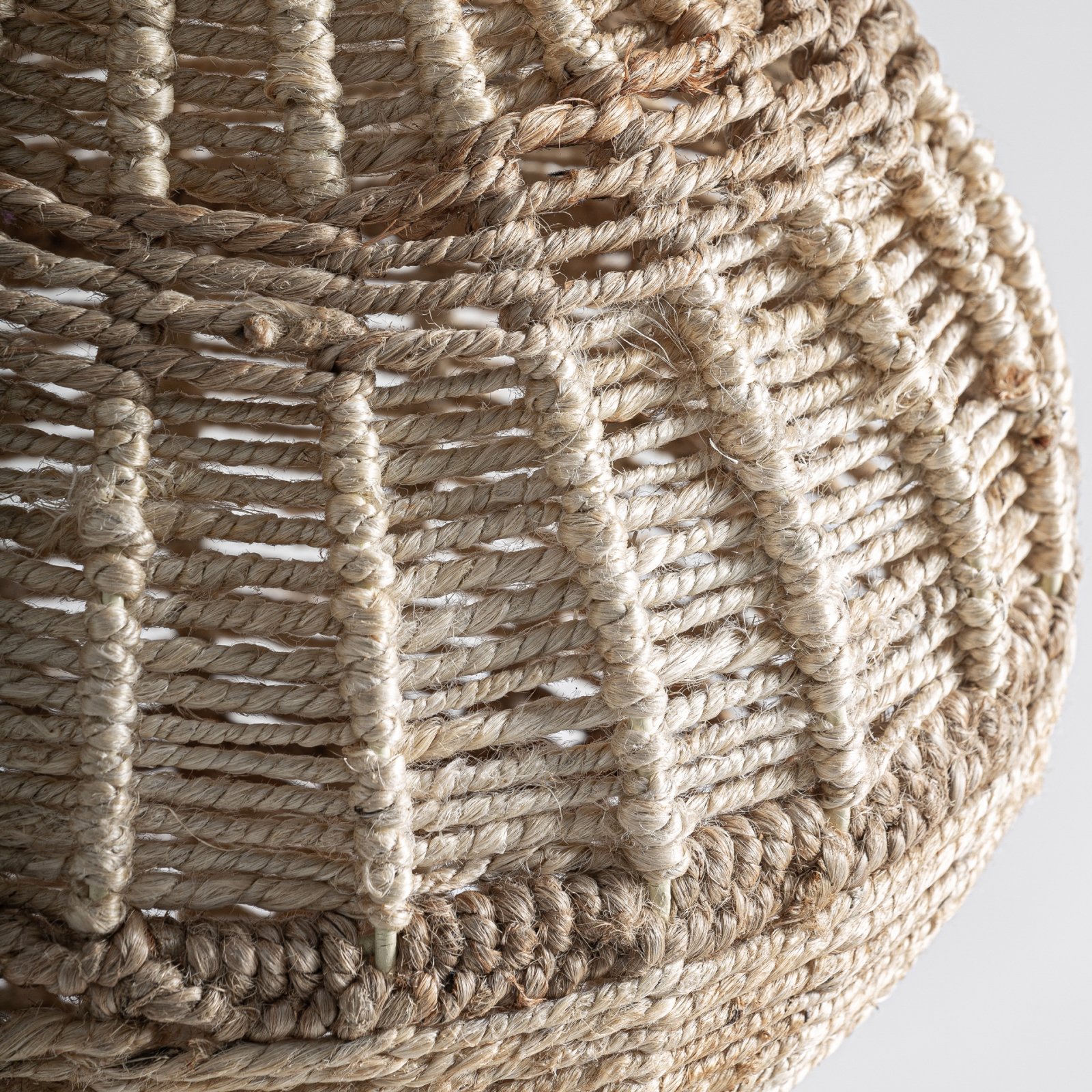 Structura este realizată din iută în culoare alb rupt, cu variații naturale de ton care adaugă profunzime și textură. Împletitura evidențiază volumele distincte ale corpului lămpii, alternând zonele mai dense cu cele aerisite și conturând o formă sculpturală bine echilibrată.