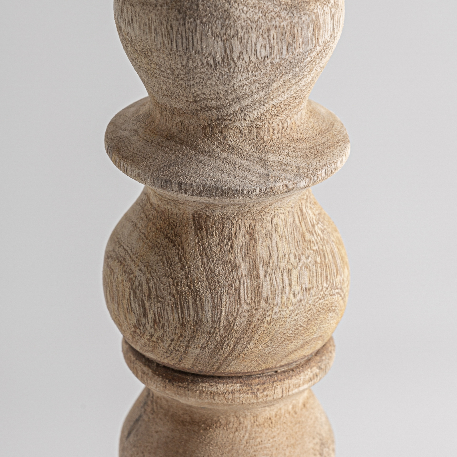 Baza lămpii este realizată artizanal din lemn de mango în nuanță maro deschis, cu detalii sculptate care evidențiază lucrătura manuală și variațiile naturale ale materialului. Fibră lemnului, diferențele de tonalitate și micile imperfecțiuni sunt parte integrantă a designului și contribuie la caracterul autentic al piesei.