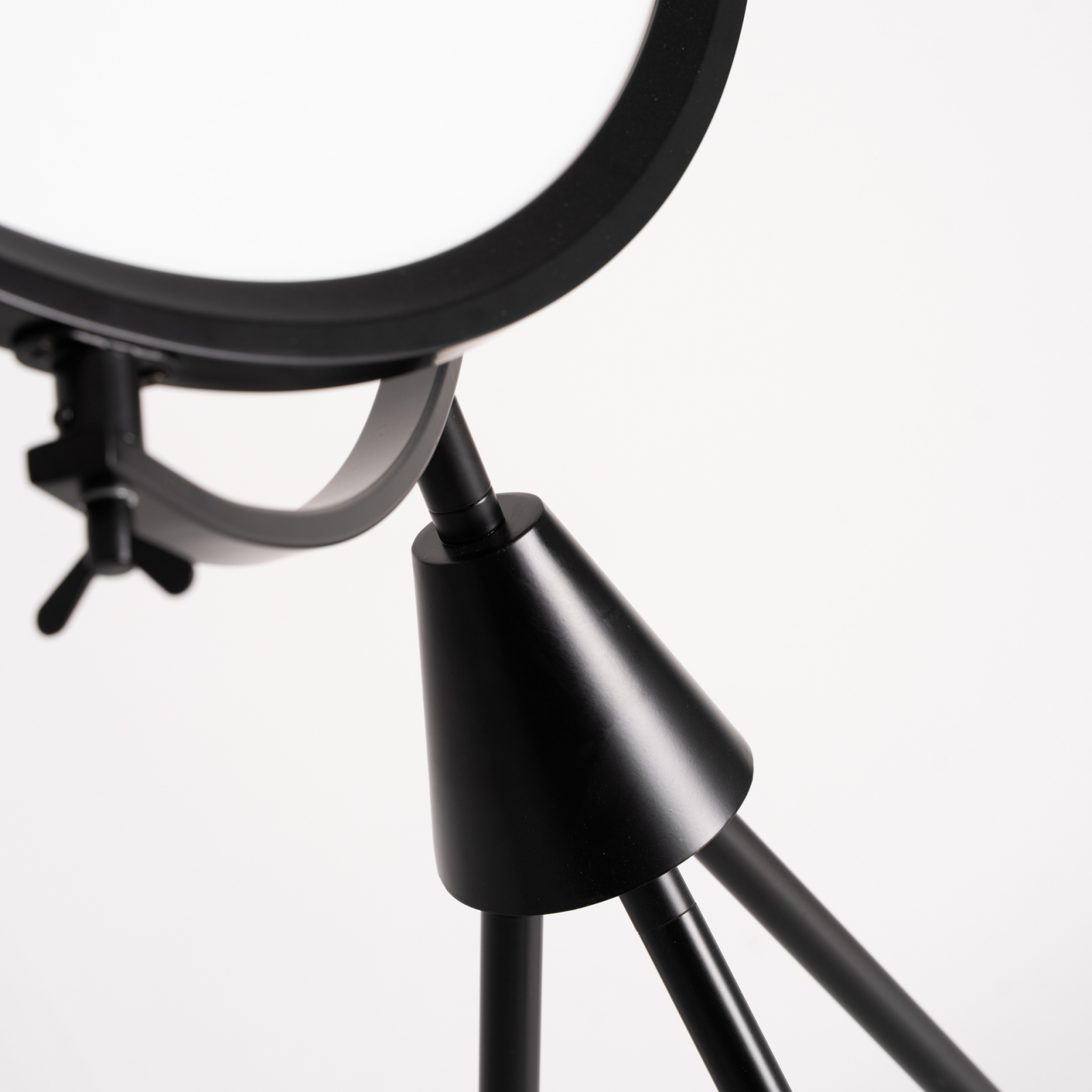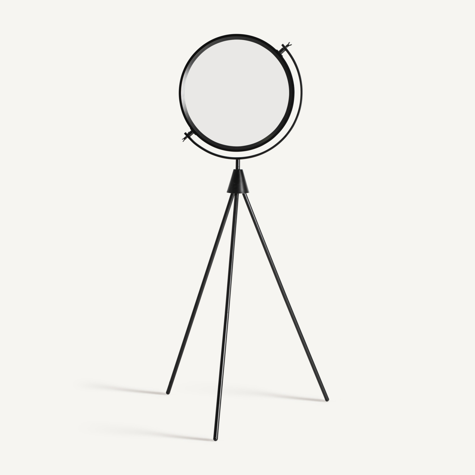Cu o prezență grafică puternică și o estetică inspirată din zona industrială, această lampă de podea se remarcă prin structura sa tip trepied și prin ecranul circular amplu. Contrastul dintre finisajul negru și suprafața luminoasă creează un accent vizual clar, potrivit pentru interioare moderne și spații cu design bine definit.